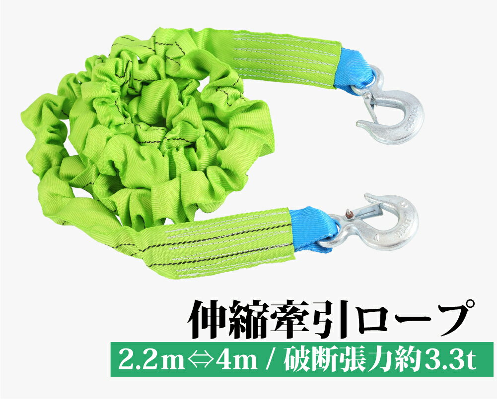 よく一緒に購入されている商品けん引ロープ 全長5m ワイド7.5cm エン3,610円 商品名 2.2m⇔4m 伸縮牽引ロープ 商品情報 バッテリーが切れた!ガス欠!など 突然のトラブルいざという時に [伸縮タイプベルト] 伸び縮みすることで引き始める際、車両への衝撃を緩和してくれる伸縮タイプ。 また、自車と牽引車の車間距離が詰まってしまった場合でもロープが自動的に 縮むため地面にロープが擦ってしまうリスクを軽減できます。 平坦な一般道路で軽自動車や自動車を牽引することを想定した破断張力約3.3tの牽引ベルトです。 ※使用環境やベルトの劣化により耐荷重量が変動する場合があります。 [ストッパー付きフック] 簡単に取り付けやすく外れにくいストッパー付きフック。 2台の車の所定の位置にひっかけるだけで簡単に車両に取り付けて使用していただけます。 商品詳細 カラー グリーン 長さ 収縮時:約2.2m / 伸長時:約4m 幅 約5.5cm 耐久性 破断張力:約3.3t 耐荷重 :約2t 商品内容 伸縮牽引ロープ×1(両端にフック付き) 注意事項 ■不良対応は未使用品に限り、商品到着後1か月以内、初期不良のみ 対応いたします。 商品が到着後必ず商品のご確認をお願いします。 ■当商品をお使いによって発生したいかなる事故につきましても 当店では責任を負いかねます。 ■モニターによって商品の色合いが異なって見える場合があります。 ■商品の仕様・デザインが予告なく変更する場合があります。 あらかじめご了承ください。 ■輸入商品の為商品に多少の汚れやほつれなどがある場合がありま す。ご了承ください。 類似商品はこちらけん引ロープ 全長5m ワイド7.5cm エン3,610円フロントガラスカバー 車 フロントカバー 凍結2,170円 レザー調 車用フック 4個セット ステンレス1,930円車用 フック 4個セット カーフック ヘッドレ1,080円サンシェード 車 フロントガラス 断熱 フロン980円車カバー カーカバー 自動車カバー カーボディ5,120円~ゴムバンド 4m 両端フック付き 幅 25mm1,250円カーカバー ハーフ カーボディカバー 車 ボデ2,980円車 ヘッドレスト クッション 2個セット カー2,980円2025/11/30 更新 商品名 2.2m⇔4m 伸縮牽引ロープ 商品詳細 カラー グリーン 長さ 収縮時:約2.2m / 伸長時:約4m 幅 約5.5cm 耐久性 破断張力:約3.3t 耐荷重 :約2t 商品内容 伸縮牽引ロープ×1(両端にフック付き) 注意事項 ■不良対応は未使用品に限り、商品到着後1か月以内、初期不良のみ 対応いたします。 商品が到着後必ず商品のご確認をお願いします。 ■当商品をお使いによって発生したいかなる事故につきましても当店では責任を負いかねます。 ■モニターによって商品の色合いが異なって見える場合があります。 ■商品の仕様・デザインが予告なく変更する場合があります。 あらかじめご了承ください。 ■輸入商品の為商品に多少の汚れやほつれなどがある場合があります。ご了承ください。
