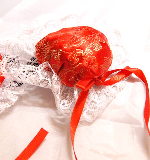 可愛いサテンのお団子髪飾りカバー(レース、ヘアクリップ付き) チャイナドレスを作るときにでる端布を使用した、可愛いお団子髪飾りです。縁にはレースをあしらい、リボンをたらしました。チャイナドレスに合わせるとポイントUP間違い無しです。 某格闘ゲームの春麗などがこのような髪飾りをしていますね。コスプレーヤの方にも是非お薦めです。 サテンお団子髪飾りのためのカバーですので、ご自分の髪の毛を包むことができます。 ・サイズ 直径φ約7cm ・リボン 約20cm ・重量 一つ約g ・色 黒//赤/ピンク/水色 4色 ・サテン製、レース ・2個1セット