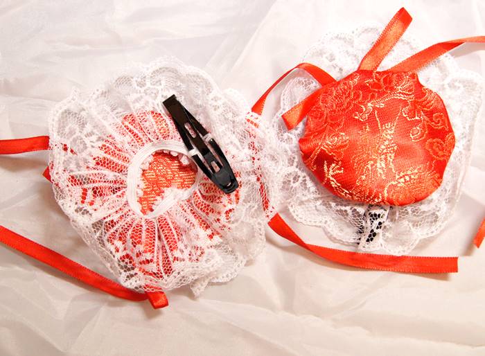 サテンお団子 髪飾りカバー(レース、ヘアクリップ付き) 2個1セット 赤色【種類=4色】