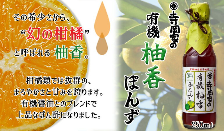 「幻の果実」と呼ばれる果実 <柚香(ゆこう)>をご存知でしょうか? 聞き馴染みもなく、にわかにその姿が連想できないのではないでしょうか。 ―そうなんです! それほどに市場に出回らない、希少な果物なのです。 柚香は徳島県の奥深い山間地、上勝町の 非常に件数が少ない栽培農家で育てられています。 1年の収穫量はなんとユズの1/100ほど! その生産量の少なさゆえに、店頭に並ぶ事もほとんどなく、 目にする事もありません。 だから柚香は「幻の」と表現されるんです。 柚香は、柚子とだいだいの自然交配種。 柑橘類では抜群のまろやかさと糖度の高さを誇り、 昔から地元では 「香りユズ・酸味スダチ・味ユコウ」と言われるほど。 とってもまろやかで薫り高い柑橘なんです。 元より希少な柚香の中でも、さらに貴重な <有機JAS認証>の柚香果汁と、 寺岡家の有機醤油とを使用し、 さらに配合する米酢やお砂糖も有機にこだわり 有機JAS認証の【有機柚香ぽんず】を作りました。 従来のぽんずとは一味違う、奥深く上品な味わい。 ぜひ一度ご賞味ください!