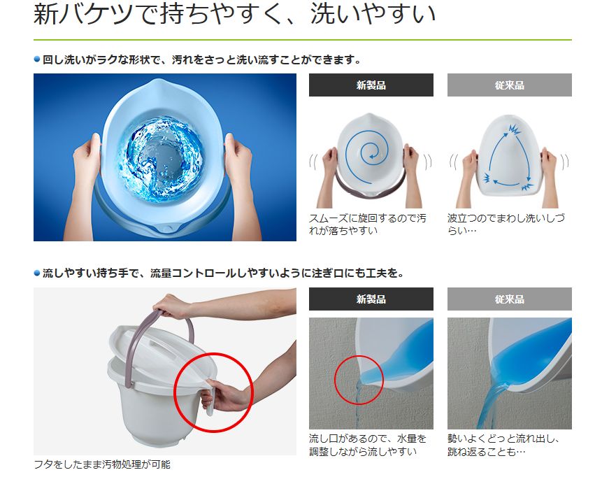 ■お部屋にすっきり納まるサイズ「コンパクトタイプ」 ・小柄な方におすすめです ■新バケツで持ちやすく、洗いやすい ・回し洗いがラクな形状で、汚れをさっと洗い流すことができます ・流しやすい持ち手で、流量コントロールしやすい注ぎ口です ■全タイプ「長穴便座」で、拭き取りしやすい ・便座口径が前後に3cm長い長穴便座です ・前に尿こぼれしにくい尿漏れガード付き ■脱臭ソフト便座 ・お尻のやせた方にやわらかい座り心地 ・脱臭器のおよその電気代:3W 0.1円/日(1日1時間使用した場合) ・電源コードの長さ:1.8m ※新電力料金目安単価:27円/kWh(税込)で計算 ■センサー式 自動脱臭 ・座るとセンサーが感知しすぐに脱臭 ・使用後自動で切れるタイマー付 ■サイズ 本体:幅49×奥行58×高さ75.5〜87.5cm 便座高さ:34〜46cm(3cmピッチ5段階調整) ひじ掛け高さ:座面より17〜26cm(3cmピッチ4段階調整) ひじ掛け内寸:40cm ■重量 14.8kg ■最大使用者体重 100kg ■材質 本体:天然木(ウレタン樹脂塗装) 座面:ウレタンフォーム・合成皮革 ソフト便座:ウレタンフォーム・合成皮革 背もたれ:ウレタンフォーム・合成皮革 バケツ・防汚トレー:ポリプロピレン ソフト便座:ウレタンフォーム・合成皮革 すべり止めゴム:エラストマ ■付属品 便座カバー、消臭液(1本)■長穴便座で尿もれしにくくふき取りしやすい
