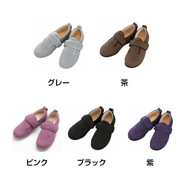 【幅タイプ別のダブルマジック3他商品】 ■基本的な幅タイプ・3E ■より幅広タイプ・7E 【ダブルマジック3の特徴】 ・大きく開くので足入れしやすい ・屈曲性と耐久性を高めたグリップ性のある靴底 ・長さ調整付きベルト ・抗菌・防臭加工 ・撥水加工 ・手洗い可能 ・カップインソール 【仕様】 サイズ:紫・ピンク:S〜3L グレー・茶・黒:S〜6L 足囲:5E(やや幅広) 重さ:[片方:L]175g 素材:ポリエステル100% 内素材:ポリエステル100% 底 材:合成底(EVA) 【選べるカラー】 ◆商品写真はお使いのモニター設定、お部屋の照明等により実際の商品と色味が異なる場合がございます。 [ 父の日 母の日 敬老 ギフト プレゼント 贈り物 介護シューズ やや幅広 むくみ 腫れ 抗菌 防臭 手洗い 洗える 施設 調節 長さ調節 ]