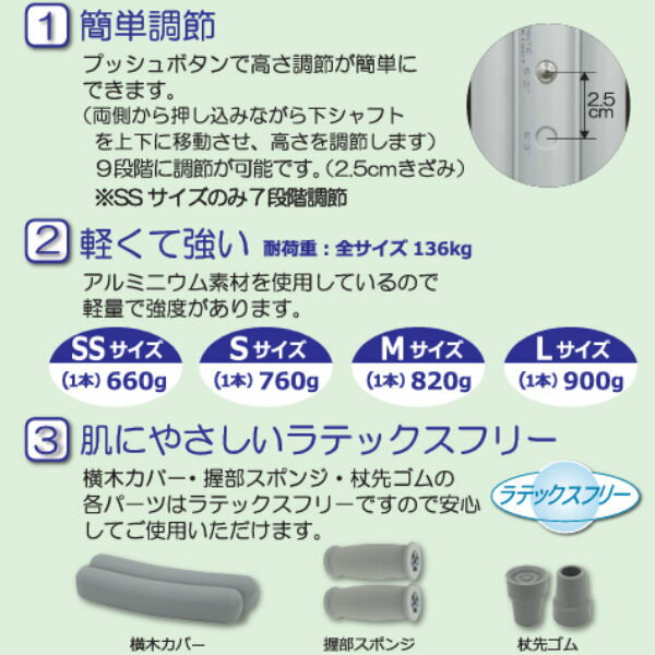 □本体はアルミニウム製のため軽量です。 □長さ調節は押しボタン式のため、手早く簡単に行えます。 □横木カバー、握部スポンジ、杖先ゴムはラテックスフリー なのでラテックスアレルギーの方にも安心です。 【材質】 ・支柱:アルミ、PP ・握り、横木カバー、杖先:TPR SS ・身長:121~137cm ・全長:78~93cm ・660g(1本) S ・身長:137~157cm ・全長:94~114cm ・760g(1本) M ・身長:157~178cm ・全長:114~134cm ・820g(1本) L ・身長:178~198cm ・全長:134~154cm ・900g(1本)
