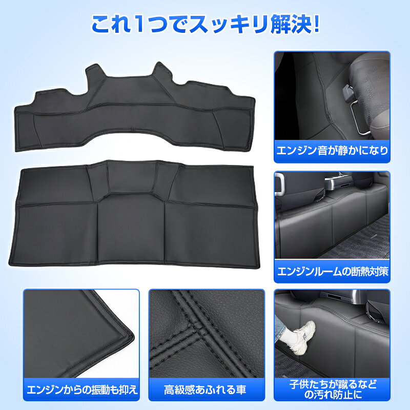 日産 NV350キャラバン E26系専用 フフロント/リア デッキカバー 商品説明 専用設計でサイズぴったり エンジン音が静かになり エンジンルームの断熱対策 エンジンからの振動も抑え 子供たちが蹴るなどの汚れ防止に 高級感あふれる車 point1 現車採寸の車種専用設計 CADデータ・CAM自動裁断機による超高精度のカッティング技術により、車種専用設計でジャストフィット! point2 汚れをしっかりガード point3 多層複合材料を採用 point4 高品質な合成レザー 上品な合成レザーを使用し、柔らかく肌触りもいいです。傷や汚れ、また日光を浴びる事による車内の温度上昇を防ぎ、防水性、耐摩耗性、耐久性にも優れています point5 エンジン音の低減及び断熱 中層は特殊吸音材がエンジンの騒音をよく吸収し車内環境が劇的に向上します。 point6 便利なマジックテープ 脱着がワンタッチで行えるテープです。非常に耐久性があり長持ちします。重ねて押さえるだけでしっかりとくっつき、軽く剥がすと外せます。 point7 高級感あふれる車 見る人に高級なイメージを与えることができます! point8 お手入れ簡単 車内環境を常に綺麗に保つため、気づいたときにサッとキレイに! 商品について 適合車種:日産 NV350キャラバン E26系 プレミアムGX 2WD H24.6~ セット内容: Aタイプ:フロント用エンジンルームカバー×1枚 Bタイプ:リア用エンジンルームカバー×1枚 Cタイプ:フロント+リア用エンジンルームカバー×各1枚 素材:PVCレザー、特殊吸音材、不織布 カラー:ブラック ※注意事項: ※お客様がご利用のモニターの設定及び特性により、実際の商品とは色味が異なる場合がございます。 ※商品のデザイン、仕様、外観、価格は予告なく変更する場合がありますのでご了承ください。 ※年式・グレード・オプション等により適合しない場合が御座います、画像とお車をご確認頂き、お買い求め下さい。 NV350 キャラバン E26系 デッキカバー フロント リア デッキカバー エンジンフードカバー 断熱 吸音 シート キックガード 汚れ防止 キズ防止 レザー調 ブラック nv350キャラバン GX パーツ カー アクセサリー NISSANN 日産 NV350 キャラバン E26系 プレミアムGX 2WD カスタム パーツ アクセサリー 便利グッズ 高級感のある上品なデザイン PVCレザー 簡単取付 お手入れ簡単