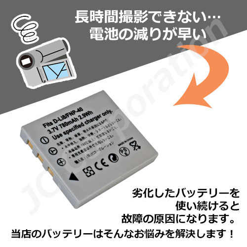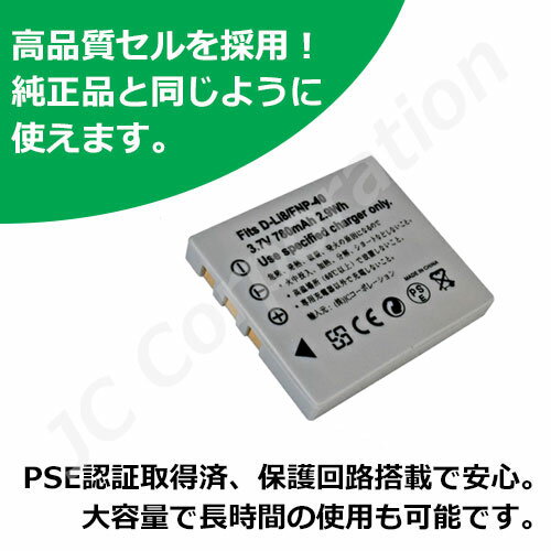 代替可能型番 (フジフィルム/FUJIFILM) NP-40 NP-40N (ペンタックス/PENTAX) D-LI8 D-Li85 (サンヨー/SANYO) NP-40 UF553436 (リコー/RICOH) D-LI8 (コダック/KODAK) KLIC-7005 (サムスン/SAMSUNG) SLB-0737 (ベンキュー/BENQ) DLI-102 適用機種 【ペンタックス/PENTAX】 Optioシリーズ A10 A20 A30 A36 A40 E65 L20 S S4 S4i S5n S5z S6 S7 SV SVi T10 T20 W10 W20 WP WPi X Optio S5iにはご使用いただけません。 電池タイプ Li-Ion 電 圧 3.7V(3.6Vでも使用できます) 容 量 780mAh 保証期間 3ヶ月 保護回路 過電流保護、過充電防止、過放電防止の保護回路が内蔵されていますので安心して使用できます。 PSE取得済 届出事業者名:株式会社JCコーポレーション PSマークの種類:PSE