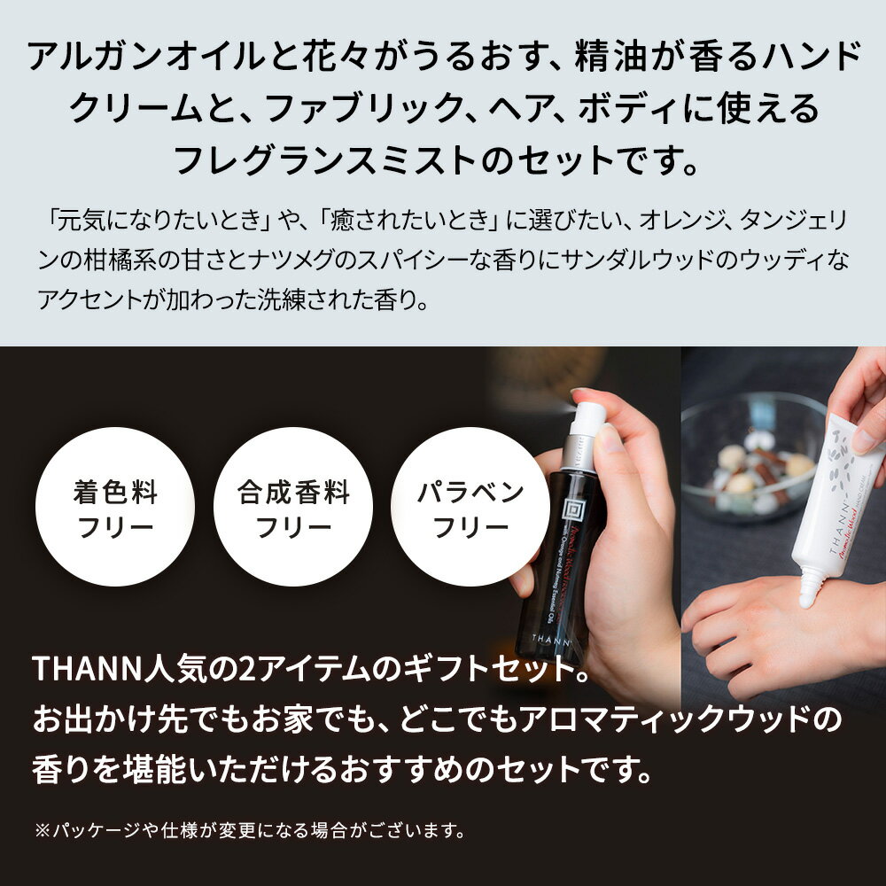 商品情報広告文責株式会社THANNナチュラル 03-6712-6630メーカー名THANN成分 【フレグランスミスト AW】エタノール、水、PEG-40 水添ヒマシ油、ミリスチン酸イソプロピル、香料(天然精油成分)、オレンジ果皮油、フェノキシエタノール、ニクズク核油、BHT、オオベニミカン果皮油、ビャクダン油 【ハンドクリーム】水、ジメチコン、トリ(カプリル酸/カプリン酸)グリセリル、ステアリン酸エチルヘキシル、ヤシ油、セタノール、オクテニルコハク酸デンプンAl、 グリセリン、ダマスクバラ花水、シクロペンタシロキサン、ステアリン酸グリセリル、シア脂、セテアリルアルコール、コメヌカ油、ステアリルアルコール、 ステアリン酸PEG-100、オレンジ果皮油、フェノキシエタノール、ステアリン酸PEG 20、カルボマー、グルコン酸Na、乳酸Na、アルガニアスピノサ核油、 TEA、ステアリン酸PEG-75、BHT、ニクズク核油、ガーデニアタヒテンシス花エキス、セテス-20、ステアレス-20、カプリルグリコール、 フェニルトリメチコン、オオベニミカン果皮油、安息香酸アルキル(C12-15)、ジメチコノール、ジメチコンクロスポリマー、 ビャクダン油、ソルビン酸K、クエン酸 ※品質向上や国際的な成分名表記方法に準じる等の理由により 全成分表示内容が変更される場合があります。 ※ボトル・キャップの色等デザインが変更になる場合がございます。 内容量【フレグランスミスト AW】60mL【ハンドクリーム】40gご使用上の注意事項【フレグランスミスト AW】本商品は精油本来の色素の影響で、黄〜ブラウン調の色調です。 ※精油本来の色が衣類やカーテン、タオル、家具等に移り、着色やシミが残る場合があります。 目立たない場所で試してからご使用になることをおすすめいたします。 お部屋やファブリック、髪や体から30cm以上離してスプレーし、香りをお楽しみください。お顔へはご使用いただけません。 本品を携帯される際はキャップとスプレーノズルがきちんと締まっていることをご確認ください。 ※火気厳禁 【ハンドクリーム】化粧品がお肌に合わないとき即ち次のような場合には、使用を中止してください。 そのまま化粧品類の使用を続けますと、症状を悪化させることがありますので、 皮膚科専門医等にご相談されることをおすすめします。 (1) 使用中、赤み、はれ、かゆみ、刺激、色抜け(白斑等)や黒ずみ等の異常があらわれた場合 (2) 使用したお肌に、直射日光があたって上記のような異常があらわれた場合生産国(製造国)タイ輸入者株式会社THANNナチュラル 検索ワード THANN thann タン タイ ナチュラル アロマティックウッド AW aw オリエンタルエッセンス OE oe エデンブリーズ EB eb アロマ ディフューザー ルームフレグランス リードディフューザー コードレス スティック ボトル インテリア オブジェ サシェ 精油 エッセンシャルオイル オイル ポプリ ソラフラワー ソラの木 オレンジ タンジェリン ナツメグ サンダルウッド レモングラス カフィルライム ハーブ ジャスミン ローズ ダマスクローズ シナモン 柑橘 シトラス フローラル ハンドソープ ハンドウォッシュ ハンドジェル 手洗い ボディウォッシュ ボディソープ トリートメント リンス ミスト フレグランスミスト キャンドル シャンプー シャワージェル アロマキャンドル ギフト 誕生日 クリスマス 2000円 2000 3000円 3000 5000円 5000 7000円 7000 お洒落 おしゃれ ホテルライク リゾート ホテル 高級 ホテルアメニティ 南国 スパ お家時間 ユニセックス ジェンダーレス ジェンダーフリー 女性 男女 男性【公式】ハンドクリーム&フレグランスミストギフトセット AW 《アロマティックウッド》タイ ナチュラルスキンケア 精油 アロマ ミスト 香水 万能ミスト コメヌカ油 柑橘系 保湿 精油が香るハンドクリームとフレッシュな香りをいつでも楽しめるフレグランスミストのギフトボックス付セット。お出かけ先でもお家でもTHANNの香りを楽しめます。 お出かけ先でもお家でも、THANNの香りを楽しめるギフトセット アルガンオイルと花々がうるおす、精油が香る「ハンドクリーム」と、ファブリック、ヘア、ボディに使える「フレグランスミスト」のボックス付ギフトセットです。 みずみずしい柑橘にしのばせたスパイスの温かみがセンシュアルで印象的な香りのアロマティックウッドコレクション。 【セット内容】 ハンドクリームAW 40g フレグランスミストAW 60ml THANNオリジナルパターンボックス(S) ※本ギフトセットに表示の価格には、ギフトボックスの代金が含まれております。ボックスのデザインはおまかせとさせていただきます。 ※リボンの色はおまかせとさせていただきます。 ※ボトル・キャップの色・デザインが変更になる場合がございます。 あらかじめご了承くださいませ。 土日祝日を除く2〜7営業日以内に発送いたします。※繁忙期や天候、交通状況により遅れる場合がございます。 1