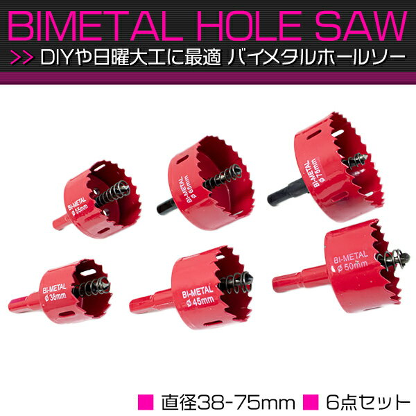 38mm/45mm/50mm/55mm/65mm/75mm 6点 セット バイメタル ホールソー 穴開け 工具 ドリル ビット 穴あけ 超硬 ホルソー ボード