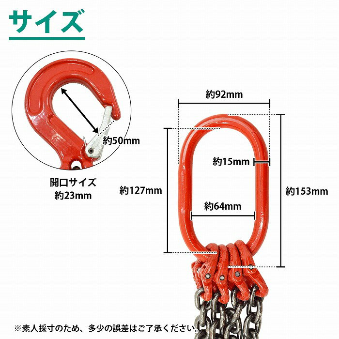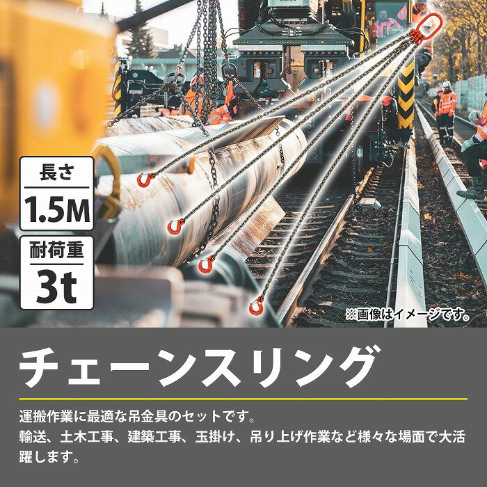 商品説明玉掛け・運搬吊り・荷役吊りなどに最適な4本吊りのチェーンストリングです。開口寸法も広く、玉掛作業が楽に行えます。輸送、土木工事、建築工事、吊り上げ作業など様々な場面で大活躍します。商品内容数量:1本タイプ:4本吊り最大使用荷重(約):3t★吊り方により使用荷重は異なりますチェーンの長さ(約):1.5mチェーン線径(約):太さ6mm※安全にご使用いただくために定期的な点検を行ってください。※当商品は海外製品のため、多少の傷、汚れなどがある場合がございます。予めご了承の上、お買い求め下さい。他はこちら!!▼マスターリンク▼[ 2t 1個 ]  [ 2t 2個セット ] [ 3t 1個 ] ▼1本吊り▼[ 1t 1M ] [ 2本セット 1t 1M ][ 2t 1M ] [ 2本セット 2t 1M ][ 3t 1M ] [ 2本セット 3t 1M ]▼2本吊り▼[ 1t 1.5M ] [ 2本セット 1t 1.5M ][ 2t 1.5M ] [ 2本セット 2t 1.5M ][ 3t 1.5M ] [ 2本セット 3t 1.5M ]▼4本吊り▼[ 3t 1.5M ] [ 2本セット 3t 1.5M ]送  料送料:送料無料 (沖縄・離島・一部地域は別途送料加算となります)※配送業者様のご指定はお受けできません。保証について※商品到着後、7日間の保証期間 お届けした商品に万一、不良・誤送・不備等あった場合、早急に対応させていただきます。 商品がお手元に届きましたらご確認をお願い致します。 期限が過ぎた場合は、いかなる場合でも対応できません。 ※お客様都合による返品・交換はお受けできませんのでご了承ください。注意事項必ず以下の注意事項をご確認ください。 ご注文は、同意の上されたものとさせていただきます。 注意事項について 商品が到着しましたら、必ず商品内容をご確認ください。 ◆買い間違いによります交換・返品等は受け付けておりません。 ◆商品画像につきましては、モニターの環境によって実際と色味が違う場合もございます。 ◆輸入品の為、スレ、汚れ等がついている場合がございます。 ◆輸入品の為、取扱・取付等の説明書が付属していない場合がございます。 ◆当店は販売のみとなりますので、取付や使用方法などのサポートはお受けできません。 ◆入荷時期により予告なく商品仕様が変更される場合がございます。 ◆弊社商品不良によって起因した工賃の補償はございません。  また、商品以外の費用の補償もできませんので、予めご了承下さい。