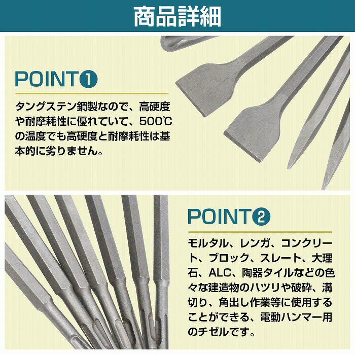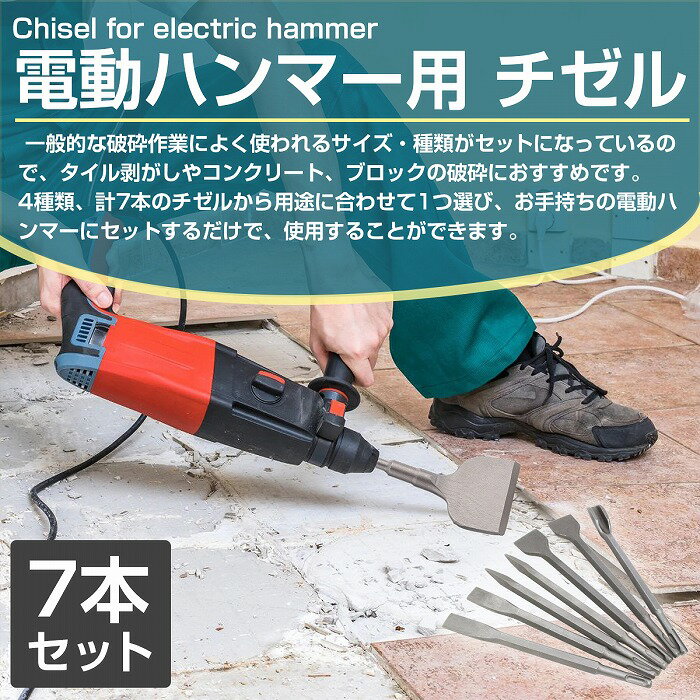 商品説明電動ハンマー用 チゼル 7点セット 一般的な破砕作業によく使われるサイズ・種類がセットになっているので、 タイル剥がしやコンクリート、ブロックの破砕におすすめです。 【タングステン鋼製】 タングステン鋼製なので、硬度、耐摩耗性、耐熱性に優れております。 【幅広い使用シーン】 モルタル、レンガ、コンクリート、ブロック、スレート、大理石、 ALC(軽量気泡コンクリート)、陶器タイルなどの色々な建築物の ハツリや破砕、角出し作業等に使用することが可能です。商品内容◆材質:タングステン鋼 ◆セット内容/全長(約) ・ポイントチゼル(2本)/24cm ・コールドチゼル(2本)/23cm ・フラットチゼル(2本)/24.5cm ・U字型チゼル(1本)/24.5cm ※当商品は海外製品のため、多少の傷、汚れなどがある場合がございます。 予めご了承の上、お買い求め下さい。送 料送料:送料無料 (沖縄・離島・一部地域は別途送料加算となります)※配送業者様のご指定はお受けできません。保証について※商品到着後、7日間の保証期間お届けした商品に万一、不良・誤送・不備等あった場合、早急に対応させていただきます。商品がお手元に届きましたらご確認をお願い致します。期限が過ぎた場合は、いかなる場合でも対応できません。※お客様都合による返品・交換はお受けできませんのでご了承ください。注意事項必ず以下の注意事項をご確認ください。ご注文は、同意の上されたものとさせていただきます。注意事項について商品が到着しましたら、必ず商品内容をご確認ください。◆買い間違いによります交換・返品等は受け付けておりません。◆商品画像につきましては、モニターの環境によって実際と色味が違う場合もございます。◆輸入品の為、スレ、汚れ等がついている場合がございます。◆輸入品の為、取扱・取付等の説明書が付属していない場合がございます。◆当店は販売のみとなりますので、取付や使用方法などのサポートはお受けできません。◆入荷時期により予告なく商品仕様が変更される場合がございます。