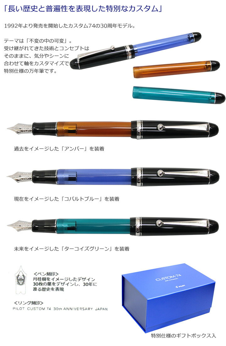 オーソドックスな万年筆 1992年より発売を開始したカスタム74の30周年モデル。 テーマは「不変の中の可変」。 受け継がれてきた技術とコンセプトはそのままに、気分やシーンに合わせて軸をカスタマイズできる特別仕様の万年筆です。 ■ペン先:14K(5号)・特別刻印入 ■本体軸3本(アンバー、コバルトブルー、ターコイズグリーン) ■軸・キャップ:樹脂 ■サイズ:最大径φ14.7mm 全長143mm ■重量:17.4g ■コンバータ(CON-70N)付属 ■特別記念インク(アニバーサリーブルー) ■特性ギフトボックス入限定 カスタム74 30周年記念モデ