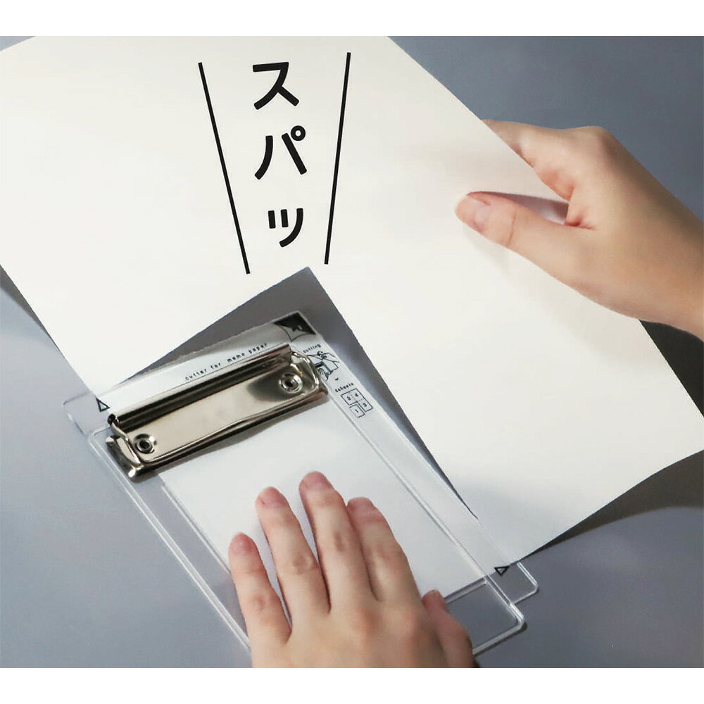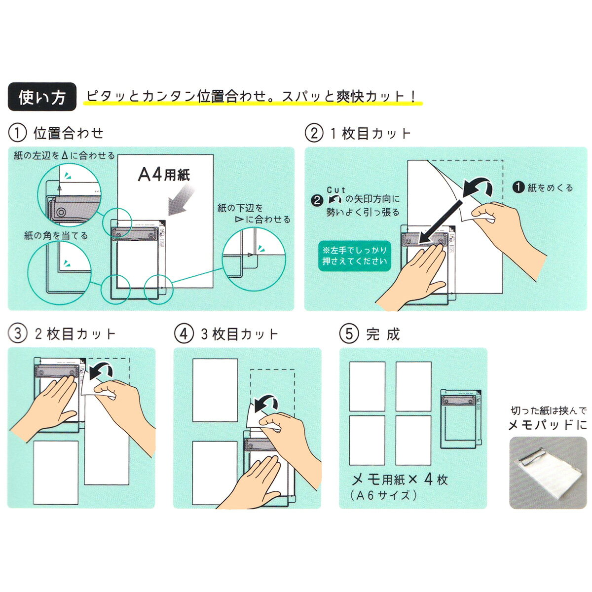 無用な用紙を簡単にカット 不要になったA4サイズの用紙を簡単に四分割(A6サイズ)にカットできるクリップボードです。 所定の位置にボードを合わせて矢印方向に用紙を引っ張ると、スパッとカットできます。 切った紙はそのままクリップに挟んでメモパッドに。 ■商品サイズ:H177×W123×D13mm ■材質:PC、スチール ◇メール便可能個数:最大2個ヨンブンカッツ