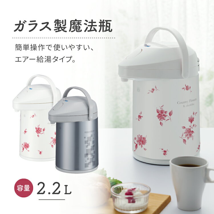 商品情報実容量2.2L色柄アーバンカントリーフラワー保温効力(10時間)76℃以上保冷効力(10時間)7℃以下本体サイズ/幅×奥行×高さ(約)19.6X24.8X31.2cm本体質量約1.62kg生産国日本注意●飲みものの保温・保冷以外に使用しないでください。●ドライアイス・炭酸飲料・牛乳・乳製品・果汁・果肉・お茶の葉など絶対に入れないでください。●本体は丸洗いはしないでください。●画面上と実物では多少色が異なって見える場合がございます。 ピーコック 魔法瓶 ポット 保温 エアーポット レトロ 花柄 2.2L 真空二重構造 保温ポット エアー給湯 回転底 まほうびん 保冷 日本製 ガラス魔法瓶 ポット 省エネ 節電 グッズ 母の日 クリスマス プレゼント ギフト 保温保冷 ガラス製魔法瓶 MPP-22ピーコック エアーポット 2.2L 保温ポット 日本製 魔法瓶 ポット 省エネ 節電 エコ 保温 保冷 レトロ 花柄 真空二重構造 エアー給湯 保温保冷 定番 ガラス魔法瓶 回転底 母の日 ギフト クリスマス プレゼント ピーコック魔法瓶 MPP-22 電気不要のまほうびん保温で上手にエコ! ●ガラス製真空二重瓶だから保温に優れています。●内瓶はガラス製なのでニオイ移りが少なく、汚れがつきにくいのでお手入れ簡単。●エアー式給湯なので電源要らずで注げます。●360°回転底なので、手元で注げます。●中せんなし構造なのでやかんからの移し替えに便利。●持ち運びに便利な可動式のハンドルが付き。●ご家庭、オフィス、レストラン、食堂、喫茶店、旅館、民宿、ホテルなどに最適。●【商品サイズ(約)】:幅19.6×奥行24.8×高さ31.2cm ●【本体重量】:約1.62kg●【容量】:2.2L●【素材・材質】 :中びん/ほうけい酸ガラス、胴部/鋼鈑、ふた・口がね・ハンドル・揚水パイプ・底部/ポリプロピレン、プッシュプレート・プッシュ止め・上ふた開閉ロック/ABS樹脂●【効力】:保温効力:76℃以上(10時間)、保冷効力:7℃以下(10時間)●【生産国】:日本 7