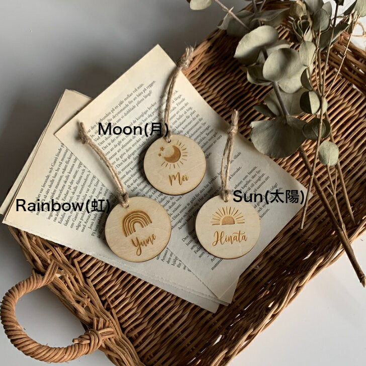 ウッドチャーム 名前オーダー バッグアクセサリー バッグチャーム プレゼント オーダー 名入れ ウッドチャーム ウッドタグ ルームプレート おもちゃ箱プレート toy box ikea 名入れキーホルダー キーホルダー sun rainbow moon おそろい ネコポス対応【wood charm】 新商品 人気商品 プレゼントにおすすめ 通園バックやレッスンバッグに 友達やご兄弟でお揃いで! 大人気!木製のウッドチャームがリニューアルしました! 当店の大人気商品ウッドチャームです。5cmの木製プレートにお名前やお好きな文字を刻印いたします。“穴あけ加工紐付き”or“穴あけ加工なし”が選択できるようになりました。穴あけ加工なしは、おもちゃ箱やルームプレートとして貼るのがおすすめ!“SUN” “RAINBOW”“MOON”“LEAF” “LEMON”“CHERRY”“SHIP”が追加!合計7種類のデザイン4種類の書体からお選びいただけます。この商品はオーダー商品となります。注文の際にカートの内の備考欄に【刻印するお名前】をご記入ください。また、変更・キャンセル不可になりますことを予めご了承ください。ご入力の通り刻印いたしますので、お間違えのないようにお願いします。ローマ字またはひらがな漢字で刻印可能です。ローマ字の場合最初の1文字目は大文字で、その他小文字とさせていただきます。文字の大きさやレイアウトはこちらにお任せいただくことを予めご了承ください。苗字とお名前を刻印する場合、こちらの判断で二行にさせていただきます。▼商品説明▼サイズ直径5cm 厚み:約5.5mm 材質木材(合板)無塗装仕上げ 紐:麻紐 当店はすべてオリジナル商品!! 家具工房にて直販の為、オーダーなのに低価格! プレゼントに最適!すべて簡易ラッピングをします 木の温もりある雑貨が好きな方 一味違う贈り物をしたい方 おうちフォトを楽しみたい方 ※ご購入前にご一読ください。▼当店のこだわりについて▼全ての商品を個包装の簡易ラッピングにてお送りしております。贈り物を開ける瞬間の“わくわく”をみなさまにお届けいたします。全て自社工房にてお作りしたオリジナル商品を販売しております。▼製品の仕上げ、衛生面への配慮▼当店の木製製品は、レーザー加工機により加工を施しております。加工の際に焦げやすすが付着しますが、独自の洗浄方法にて丁寧に洗浄と消毒をした後、乾燥、研磨、エアー洗浄をしてから検品してお客様のもとへお届けいたします。また、厚みのある木材を使用することにより、強度が高いのも当店の製品の特長です。▼納期について名入れ商品は14営業日以内に出荷(予備日含む)、名入れ以外の小物商品は3営業日以内に出荷しております。▼レビューについてお客様の声を今後に生かすため、商品レビューのご記入をお願いしております。商品レビューをご記入いただきましたら、当店オリジナルミニ木製小物をプレゼントいたします。▼注意▼モニターの発色により、実物と異なる場合があります。本製品は天然素材を使用しており、木目や節があり色目にばらつきがあります。時間が経過することにより木材の断面等にトゲやささくれ等が発生する恐れがあります。加工による焦げから多少においが残っている場合があります。水濡れや湿気の多い状態でご使用されますと破損や変形の原因になり、カビが発生する恐れがあります。水濡れや湿気の多い状態でご使用や保管をされますと変形したりカビが発生する恐れがあります。本製品が汚れてしまった際には、乾いた布でふき取って下さい。先端部分が尖っていることがありますので、ご使用の際には十分注意していただき、小さなお子様のお手に触れないようにご使用ください。 名入れ商品、14営業日以内に出荷1
