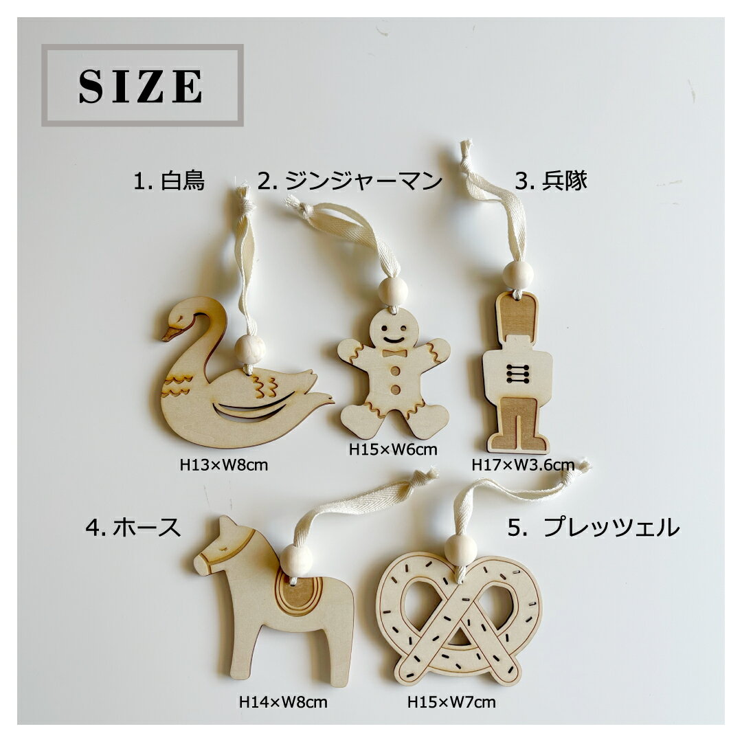 wood toy クリスマスオーナメント 5個セット おもちゃオーナメント クリスマス限定 予約販売 クリスマスツリー クリスマスプレゼント クリスマスフォト メリークリスマス ウッドオーナメント クリスマス飾り 木製オーナメント ネコポス対応【woodtoyオーナメント 5個セット】 新商品 人気商品 クリスマスツリーの飾りにおすすめ!! クリスマスの飾りにおすすめ!木製オーナメント5個セットです。 ※こちらの商品は数量限定、期間限定のご予約商品です。海外のおもちゃ箱にありそうな、ナチュラルな木の素材が優しいクリスマスオーナメント。お好きなツリーに飾ったり、流木などにぶら下げてガーランドのように飾るのもおすすめ!おしゃれに飾ってクリスマスをお楽しみください。収納巾着がついていますので、保管も安心。サイズ:1.白鳥 全長:約13cm 横幅:約8cm木の厚み:約4mm2.ジンジャーマン 全長:約15cm 横幅:約6cm木の厚み:約4mm3.兵隊 全長:約17cm 横幅:約3.6cm 木の厚み:約4mm4.ホース 全長:約14cm 横幅:約6cm木の厚み:約2cm5.プレッツェル 全長:約15cm 横幅:約7cm木の厚み:約2cm※形によって大きさは多少異なります。巾着:ポリエステル100% 18cm×18cm材質木材(合板)無塗装仕上げ 紐:綿100% 当店はすべてオリジナル商品!! 家具工房にて直販の為、低価格! プレゼントに最適!すべて簡易ラッピングをします! 木の温もりある雑貨が好きな方 一味違う贈り物をしたい方 おうちフォトを楽しみたい方 ▼当店のこだわりについて▼全ての商品を個包装の簡易ラッピングにてお送りしております。贈り物を開ける瞬間の“わくわく”をみなさまにお届けいたします。全て自社工房にてお作りしたオリジナル商品を販売しております。▼納期について名入れ商品は14営業日以内に出荷(予備日含む)、名入れ以外の小物商品は3営業日以内に出荷しております。予約商品の場合は各商品に記載の納期にて発送いたします。▼レビューについてお客様の声を今後に生かすため、商品レビューのご記入をお願いしております。商品レビューをご記入いただきましたら、当店オリジナルミニ木製小物をプレゼントいたします。▼注意▼モニターの発色により、実物と異なる場合があります。本製品は天然素材を使用しており、木目や節があり色目にばらつきがあります。時間が経過することにより木材の断面等にトゲやささくれ等が発生する恐れがあります。加工による焦げから多少においが残っている場合があります。水濡れや湿気の多い状態でご使用されますと破損や変形の原因になり、カビが発生する恐れがあります。水濡れや湿気の多い状態でご使用や保管をされますと変形したりカビが発生する恐れがあります。本製品が汚れてしまった際には、乾いた布でふき取って下さい。先端部分が尖っておりますので、ご使用の際には十分注意していただき、小さなお子様のお手に触れないようにご使用ください。 予約商品12月4日より順次出荷1