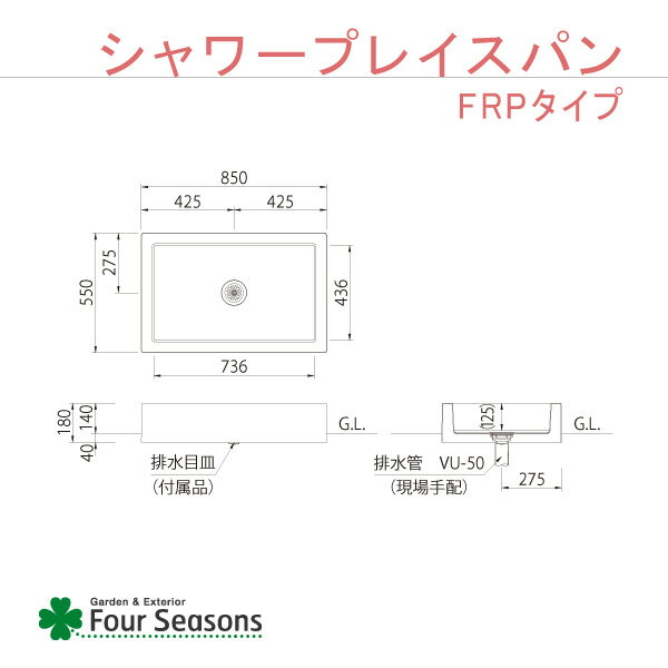 こちらの商品は受注生産になります為、日時指定をお受けできかねます。ご了承くださいませ。 <シャワープレイスパンFRPタイプ> カラー ・・アイボリー(IV) サイズ ・・幅850×奥行550×高さ180(mm) 素材 ・・FRP製 重量 ・・7kg 取付方法 ・・給排水工事が必要です。専門の業者に依頼することをオススメします。 備考 ・・蛇口は別売りです。「蛇口」のページよりお好きなものをお買い求めください。 在庫切れの場合は別途ご連絡いたします。 蛇口・補助蛇口は別売です。 「蛇口のページ」からお選びください。お好きな水栓柱と組み合わせてオリジナルな立水栓をお庭に! シャワープレイスパン FRPタイプ FRPタイプ専用すのこ 専用すのこは、別売りとなります。こちらから別途お買い求めください。 製品名称 規格名称 寸法(W×D×H) 重量(kg/個) カラー 備考 シャワープレイスパン FRPタイプ PF-SP-PF 850×550×180 7 IV FRP製 ※写真と実際の商品とでは、若干異なる場合がありますのでご了承ください。 ※パン表面は塗装仕上げです。キズや擦れ等、取扱いには十分ご注意ください。 ※コンクリート製品は、通常「白華」現象を起こします。これは製品の強度や環境に悪影響を及ぼすものではありませんので、ご了承ください。 ※こちらの商品は「受注生産品」となります。