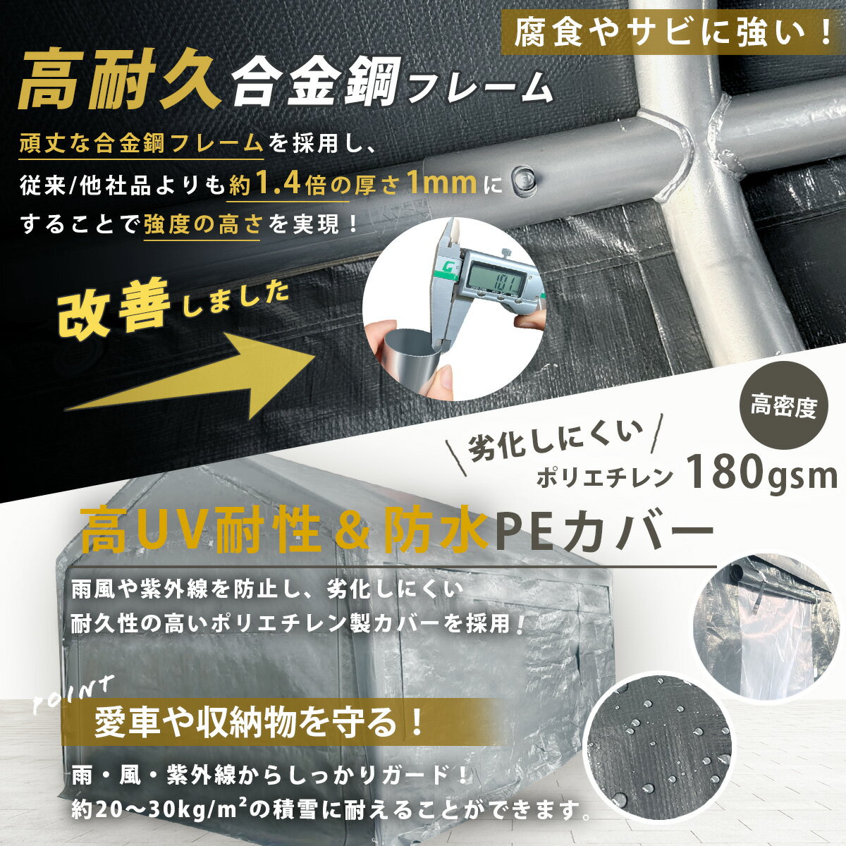 商品詳細 ・サイズ:幅3m×6m×高さ2.75m ・重量:約63kg ・パイプのサイズ:直径38mm × 厚み1mm ・付属品:簡易スパナ、ペグ、固定ロープ、手袋、取扱説明書 重要 【組立について】 ・設置する場所が水平になっているか確認してから作業を始めてください。水平でない場合、パイプを固定する際や強風の際に、パイプが曲がってしまう恐れがあります。 ・組み立ては風が強くない日に行ってください。風が強い日に組み立てを行うと、完成する前の不安定なハウスの体制時にパイプが曲がったり、周辺に危険が及ぶ可能性があります。 【設置/固定について】 基本的にはどのような場所でも設置が可能です。付属のペグとロープでの固定以外にも、場所によっては別途販売しております重し袋やアンカーをご利用いただき、各パイプを固定する方法もございます。また、土嚢や砂袋などを紐にくくりつけ、テント全体を上から押さえて固定する形もございます。皆様の環境に合わせて、特に風が強い地域の場合はしっかりとした固定対策を必ずお願いいたします。想像以上に雨風の力は強く、しっかりとした対策がなされない場合、ハウスが倒壊する恐れがございますので、必ず対策をお願いいたします。(台風や大雪の際は、一時的にテントを解体されることを強く推奨いたします) 特徴 ★パイプの厚みを従来の1.4倍★ 他社/従来品の一般的な厚み0.7mmより約1.4倍の1mmの厚みにすることで、パイプの強度が増し、ハウス全体重量も約1.3倍(49kg→63kg)になり、ハウス全体の強度が向上(アップグレード)してます。 【幅広い用途】 車・自転車・バイク、重機、資材など様々な物の収納・保管場所として活用できます。 また、屋根・側面・前後の分離式で取り外し可能なため、アウトドアでのテントや防災用テントとしても利用可能です。 【商品素材】 パイプは頑丈な合金鋼フレームを採用しているため強度が高く、錆や腐食にも強いため、屋外利用に最適です。 カバーは高UV耐性&防水の180gsmのPEカバーを採用。耐久性が高く、劣化しにくいため、愛車や収納物を雨風、雪、紫外線などからしっかり守ります。 【換気デザイン】 各サイドにそれぞれ2つのメッシュ窓を備えておりますので、夏場の熱気を逃したり、冬場に寒暖差で起こる結露を軽減することが可能です。 【簡単な組み立て】 工具不要のジョイント式で、ボタンをはめ込むだけでパイプの接続が可能です。またそれぞれのパーツは番号シール付きで、わかりやすい日本語の組立説明書も同梱しておりますので、初めての方でもスムーズに組み立てることが可能です。 ■キーワード ガレージテント 車庫 車庫テント パイプ車庫 テントガレージ カーポート テント キャノピー タープ タープテント スチールテント カバー 屋根 仮設テント 仮設倉庫 野外テント 野外駐車場 サイクルテント バイク 自転車 車 大型 物置 物置小屋 収納 野外収納 日よけ 黄砂 汚れ防止 防犯 守る 台風 防災 強風 アウトドア キャンプ レジャー バーベキュー 物販 お祭り イベント 子ども 雨天 農業 農機具 畑 田んぼ 工業 林業
