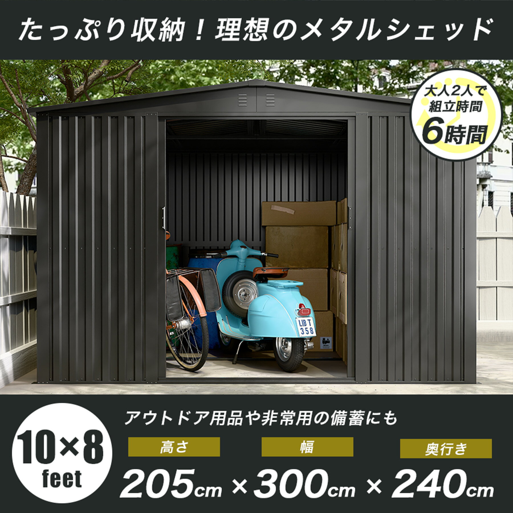 【床材あり】【フレーム式】物置 屋外 大型 倉庫 おしゃれ 10×8フィート 幅300 × 奥行240 × 高205cm 鍵付き メタルシェッド スチール 引き戸 タイヤ保管 大容量 野外 小屋 屋外物置 屋外倉庫 おしゃれ物置 屋外物置小屋 屋外型物置 収納