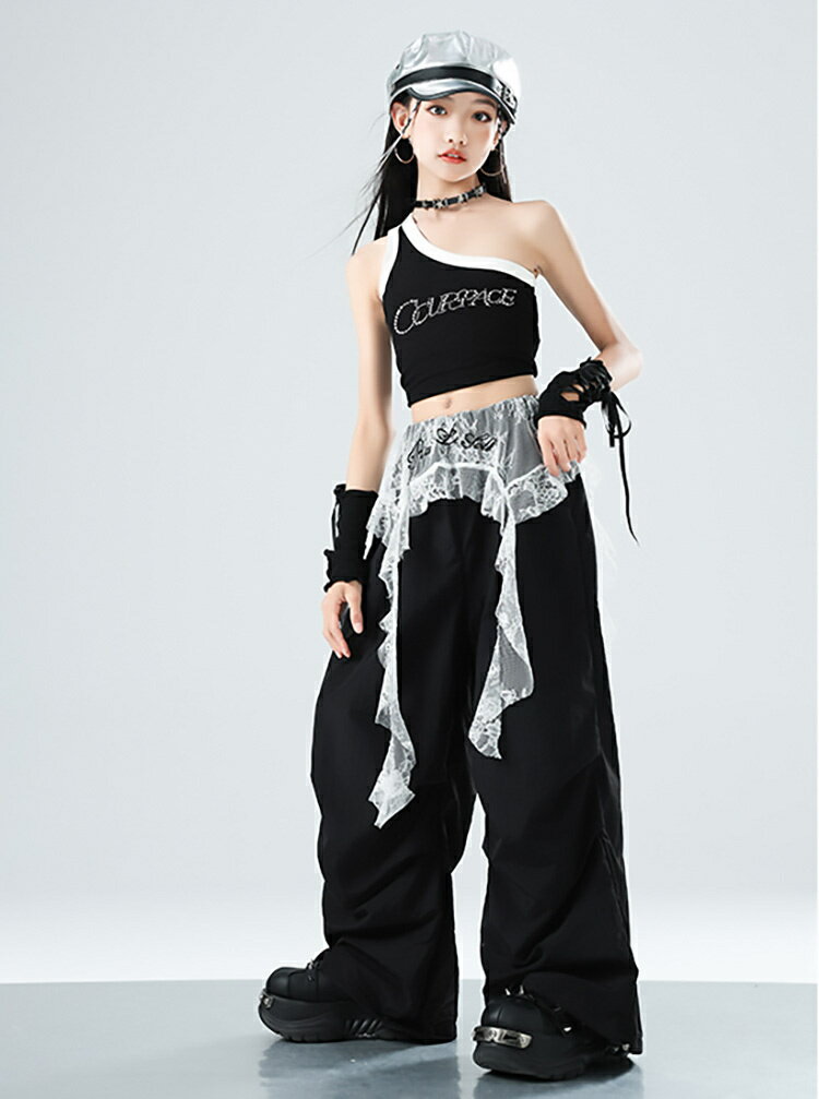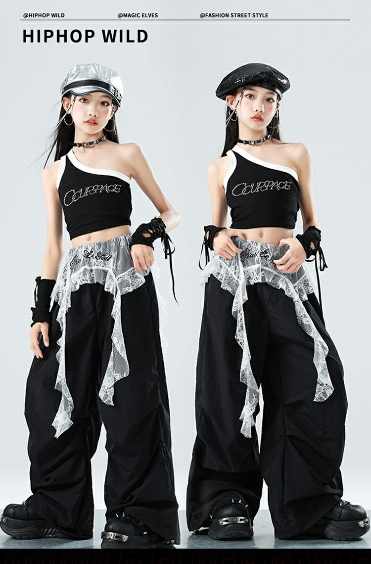 黒 K-POP 衣装 キッズ ダンス衣装 ヘソ出し セットアップ チョッキ ダンスパンツ ヒップホップ 女の子 デザイン 韓国風 HIPHOP アイドル衣装 おしゃれ ダンスウェア 舞台服 演出服 派手 チアガール 子供服 jazz 練習着 普段着 団体服 おしゃれ 夏
