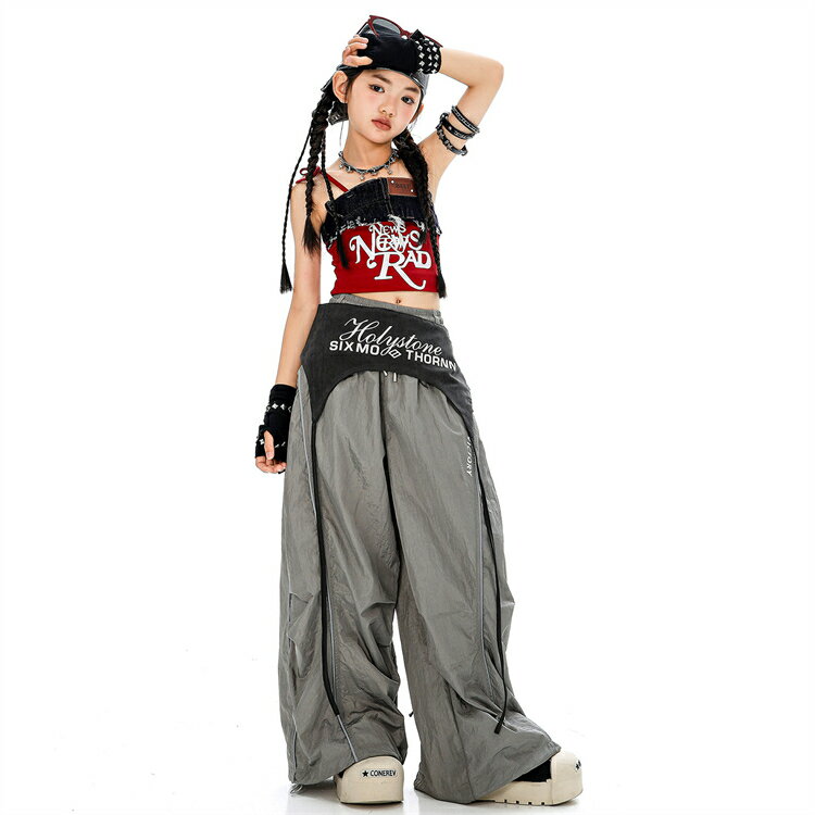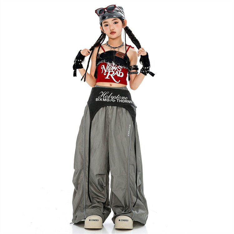 ダンス衣装 キッズダンス 赤色 セットアップ 女の子 ステージ衣装 日常 キッズダンス衣装 チョッキ カーゴパンツ 上下 演出服 かっこいい キッズ ファッション ガールズ ダンスウェア 子供服 練習着 応援団 HIPHOP ヒップホップ おしゃれ グレー レッド