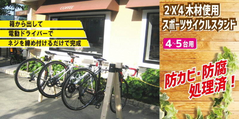 LEGGREZZA SPORTS/レグレッツァスポーツ 木製サイクルスタンド 1800-NA ブラック(56000) スポーツサイクル用 ディスプレイスタンド 駐輪スタンド 自転車スタンド 木製スタンド 人気の木製サイクルスタンドに要望の多かったブラックをラインナップ。 落ち着いた上品な黒でモダンな建物に非常にマッチします。 木材は職人が一本一本手作業で表面処理を行っております。 また、複数回にわたる塗装・防腐処理を行い高級感のある仕上がりに。 ★4〜5台向け ●2×4木材を使用したスポーツサイクル用駐輪スタンド ●防カビ・防腐処理済! 箱から出して、電動インパクトドライバーでネジを締め付けるだけで完成! 【重要!】お買い上げ前にご確認願います 天然素材の加工品の為、木目、筋目、ヒビ、ささくれ等が有る可能性が有ります。 バイクスタンドの木材は、常緑針葉樹で節などが有る一般的な2x4木材です。 節には補修材パテ等を塗り込んでいる為に、色が不自然になる場合があります。 ご了承の上、お買いもとめ下さい。 上記理由による返品や交換は致しかねます。予めご留意願います。 ◆強風に倒れにくくするには・・・ 脚部が狭くならないよう、突っ張り棒等を取り付けよう。 ◆複数のスタンドを連結したいときは… 木材部分に穴を開けロープ等で連結しよう。 ■製品仕様 ・駐輪台数:4〜5台向け ・全 長 :約183cm ・全 高 :約107cm ・全 幅 :約 51cm ・重 量 :約 10kg ■パッケージ内容 ・上部バー: 1 本 ・脚部バー: 2 組(簡易組立済) ・脚部金具: 4 個 ・取付ビス:約50本(コーススレッド:3.8 x 38 mm) ※使用例の写真はナチュラルカラーとなります。
