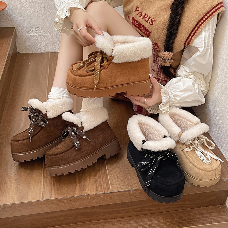 もふぽか 25年秋冬新作 ヴィヴィアン ムートンブーツ 厚底 ブーツ ショート レディース ファー リボン 撥水 防水 雪 雨 ブラック 黒 厚底ムートン 厚底ブーツ