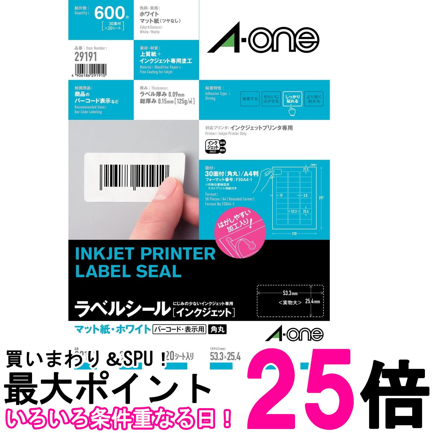 エーワン ラベルシール インクジェット A4 30面 20シート 29191 送料無料 【SG62005】