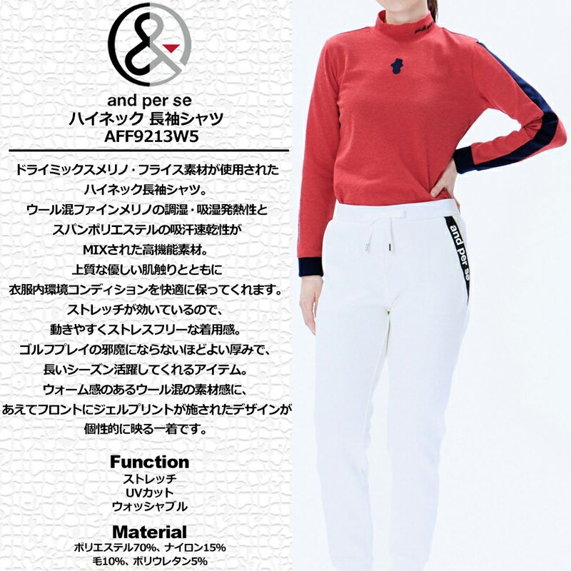 検索用: ストレッチ 保温 吸汗速乾 ドライ DRY 調湿 吸湿 ブラック ホワイト グレー ネイビー ブルー レッド 黒 白 ストレッチ 長そで ロゴ おしゃれ オシャレ デザイン ブランド ゴルフウェア ゴルフウエア レディースウェア レディースウエア ゴルフシャツ レディースモック ゴルフモック レディースシャツ アンパ スイ シイ アンパシィ アンパシー アンパンジー ゴルフ トップス アパレル ゴルフ女子 女子 女性用 レディス レディース WOMENS WOMEN'S ウィメンズ 春 秋 冬 レディースウェア ゴルフウェア ゴルフ場 ゴルフコース ラウンド メーカー希望小売価格はメーカーカタログに基づいて掲載していますドライミックスメリノ・フライス素材が使用されたハイネック長袖シャツ。 ウール混ファインメリノの調湿・吸湿発熱性とスパンポリエステルの吸汗速乾性がMIXされた高機能素材。 上質な優しい肌触りとともに衣服内環境コンディションをOn/Off問わず快適に保ってくれます。 ストレッチが効いているので、動きやすくストレスフリーな着用感。 ゴルフプレイの邪魔にならないほどよい厚みで、長いシーズン活躍してくれるアイテム。 ウォーム感のあるウール混の素材感に、あえてフロントにジェルプリントが施されたデザインが個性的に映る一着です。 ■素材 DRYMIX/メリノ片袋フライス (ポリエステル70%、ナイロン15%、毛10%、ポリウレタン5%) ■特徴 ストレッチ UVケア ウォッシャブル ■洗濯表示 手洗い洗濯可能(液温40度以下)/ダンブル乾燥禁止/漂白剤使用禁止/弱いウェットクリーニング可能 ■特記事項 ※カラーホワイトは他のカラーに比べ多少の透け感があります。 ※当店は[and per se]正規販売店です。 ※お使いのコンピュータ環境によっては写真のカラーが実際の商品と異なって見える場合があります。 ■■■配送方法に関して■■■ 当商品は『メール便配送対応』商品です。 ●注意事項 ・事故補償は一切ございません。 ・梱包サイズの関係で、外装パッケージから取り出して梱包させていただく場合がございます。 ・代金引換でのご注文はお受けできません。 ・翌日お届けサービスの対象外です。