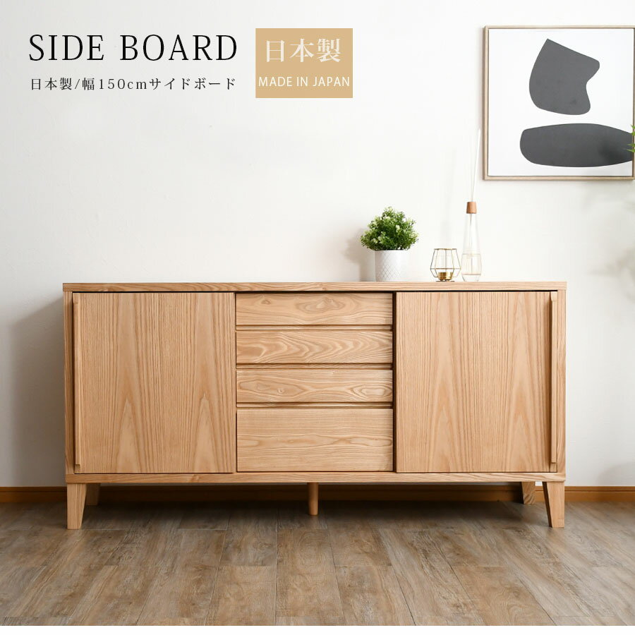 【クーポン発行中 26日23:59まで】 サイドボード キャビネット 幅150cm 150 おしゃれ 天然木 無垢材 ナチュラル 北欧 シンプル 国産 日本製 リビング収納 可動棚 引出し 完成品 木製 リビングボード 収納棚 和風 洋風 ブラックアッシュ タモ 桐