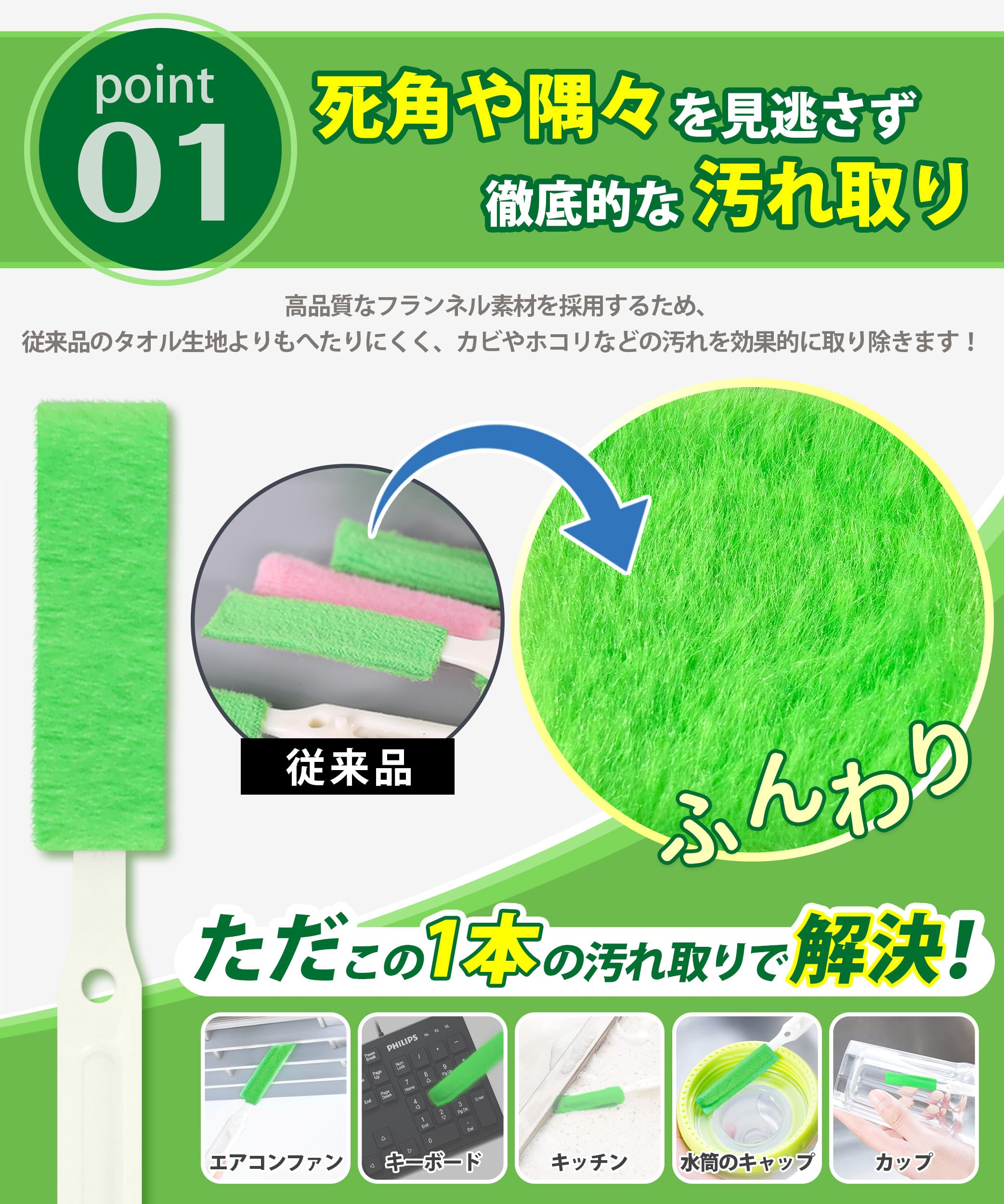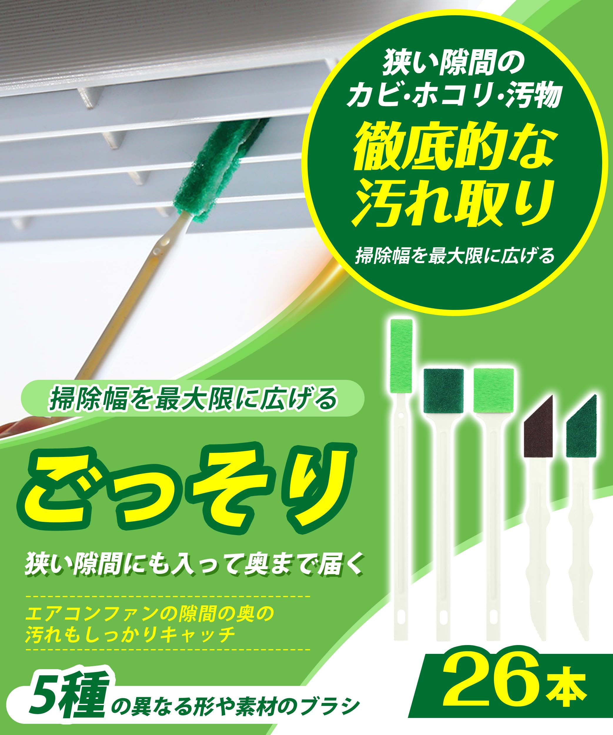 商品情報商品の説明説明 エアコン 掃除 ブラシ 隙間ブラシ【死角や隅々を見逃さず?4種ブラシで掃除の幅を広げる】 隙間掃除 水筒 トイレ掃除 キッチン掃除 ファン隙間に入る 隙間掃除グッズ 水回り掃除 空気清浄機掃除主な仕様 ?????【5種ブラシで掃除の幅を広げる?26本大容量セット】このクリーニングキットには、フランネルブラシ、不織布ブラシ、幅が広がるブラシ、不織布先のとがった形状のブラシ、サンドペーパーを含む5種類の使い捨てブラシが含まれています。?26本入り(20本*1種+2本*2種+1本*2種)の大容量セット!20本の隙間ブラシは、マイクロファイバー素材で作られており、優しくクリーニングでき、キズをつけることなく効果的に汚れを落とし、吸水性効果があります。2本のマイクロファイバーと2本の不織布ブラシは、幅広くなるデザインが採用されており、クリーニング面積を広げ、泡立ちが速く、中小規模な迅速なクリーニングに適しています。また、不織布先のとがった形状のブラシは強力なクリーニング力で小さな汚れを効果的にこすり落とすのにも適しています。長いハンドルのデザインは、触れるのが難しい小さな角をきれいにすることができます。?さらに、1本の隙間ブラシにはさび取り用のサンドペーパーが付いており、頑固な焦げ付きにも対応します。?【死角や隅々を見逃さず?徹底的な汚れ取り】高品質なフランネル素材を採用したエアコン 掃除 ブラシは、狭い隙間や奥深い箇所まで届き、日々蓄積するカビ?ホコリなどの汚れを根こそぎ絡め取ります。また、エアコン 掃除 ブラシの持ち手先端は汚れを削り取るヘラが設計されており、頑固な汚れには柄の部分でしっかりと対応できます。?細かい隙間や手の届きにくい箇所も簡単に掃除でき、煩雑な清掃手順は必要ありません。浴室のタイルの隅、トイレの底部、もしくは窓のサッシなどの狭いスキマも、ただこの1本の汚れ取りで解決!軽くふるだけで清潔な状態に保つことができるエアコン 掃除 ブラシ。?使いやすさと効率的な清掃体験により、お客様の掃除の負担を軽減し、清潔な環境を維持するお手伝いをいたします。?【使い捨てても、洗って繰り返し使ってもOK!】このトイレ掃除 ブラシはエアコン、換気扇、ルーバー、エアコンファン、お風呂、トイレ、キッチン、扇風機、サーキュレーター、洗濯機、サッシなど、家中の隅々まで広範囲に活躍します。?使用後に捨てることができるので、掃除時間を無駄にしません。特にトイレの掃除や汚れのひどい箇所は使い捨てられ、衛生的です。一方、水筒のキャップの隙間掃除などは洗って何度も再利用できます。?また、耐久性に優れた素材で作られており、ブラシ部分の厚みを大幅に増やすことで、破れにくく丈夫になっています。洗って繰り返し使用することができます。?【滑り止めハンドル設計?安全性を与え】エアコン ブラシのハンドルは滑り止め付きので、安全性と効率性を両立させた優れた設計です。高品質のハンドル素材と滑り止めの設計により、安定したグリップを確保し、使用中の滑りを防ぎます。?これは、清掃作業をよりスムーズに行うことができ、使用者の安全を守ることができます。耐久性にも優れたエアコン ブラシのハンドルは、高品質な素材とノンスリップ設計によって、継続的に安定した握り心地を提供し、そこから滑り落ちることはありません。?つまり、エアコン ブラシは清掃効率が向上するだけでなく、使用者の安全性も確保されるという2つの利点を兼ね備えています。?【使いやすい?収納便利な掃除に欠かない相棒】?隙間ブラシはフックのデザインを採用され、収納が簡単で、スペースを節約できます。お手洗いやキッチンに掛けておくと、いつでも手軽に取り出して使うことができます。隅々まで徹底的に清掃することができ、新しい清掃の喜びを感じることができます。?また、隙間ブラシ部分は微妙にカーブしているため、隙間にピッタリフィットして汚れをしっかり取り除けます。手軽さと使いやすさを追求した隙間ブラシは、日常の清掃を効率化し、快適に行うことができます。