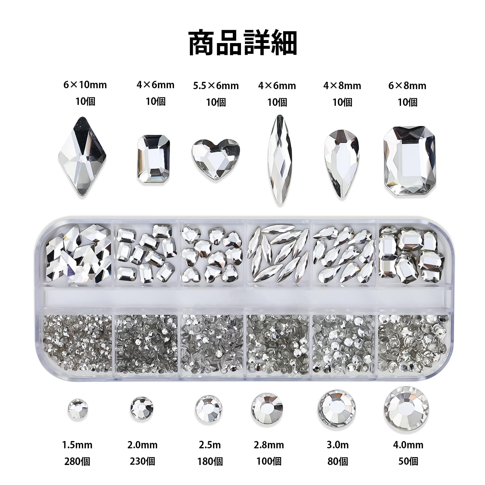 商品情報商品の説明1主な仕様 【豊富な形のラインストーン】 ラインストーンネイルストーンには12種類の異なる形状とサイズのクリスタルホワイトダイヤがあります。さまざまなネイルデザインをDIYしたり、装飾としても最適です!br【数量】約980粒入り。形状にはダイヤ、四角、丸、ハートがあります。収納ケース付きで、整理整頓して失くす心配はありません。br【素材】カラスクリスタル製で、耐久性が高いです。キラキラ輝くラインストーンは、美しく輝き、あなたのDIYデザインに輝きと魅力を加えます。br【幅広い用途】ネイルDIYや小物の装飾、スマートフォンケース、DIY手芸、宝石、ヘアアクセサリー、雑貨、服、靴などに使用できます。DIYデザインが好きな方に特におすすめです!br【完璧なギフト】家庭やネイルサロンでも使用できます。ネイルが好きな友達への贈り物やバレンタインデーのギフトに最適です。