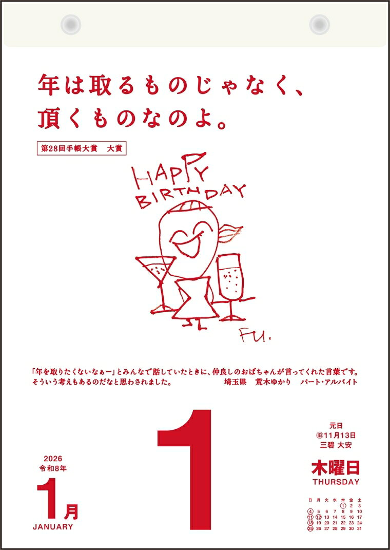 商品名 ・E501 名言・格言 日めくり カレンダー 手帳大賞作品集 詳細 ・始まり年月 :2026 1月始まり ・種類 :カレンダー ・品番 :84471_e501 ・サイズ :B5 ・メーカー名 :TAKAHASHI / 高橋書店 ・高橋の日めくりカレンダー[B5サイズ] ・手帳文化向上を目的として始まった「手帳大賞」も、おかげさまで30回目を迎えます。 ・毎日の暮らしに活力をあたえる名言・格言として発表すべく、「日めくりカレンダー」にして世に送り出しています。 ・身近な人の『思わず手帳にメモしたくなった名言・格言』を掲載。 ・心に響く感動的なものから、思わず笑ってしまうものまで、人生に活力を与えてくれる手帳大賞作品集です。 ・六曜・節気・旧暦・九星入りで、日めくりカレンダーとしての実用性もバッチリです。 ・3名のイラストレーターによる、その日の名言に合わせた絶妙なイラストも楽しめます。 ・★商品詳細★ ・【曜日始まり】日曜始まり ・【タイプ】日めくりカレンダー ・【サイズ】B5(縦257mm×横182mm) ・【スペック】 ●旧暦 ●六曜節気 ●九星 ↑抜群の収納力!インナーキャリング↑↑ショルダーストラップ↑↑当店オリジナル★バースブックノートはこちら↑↑ロルバーンガチャ↑↑お買い物の相棒↑↑何枚でも欲しくなる!新柄続々入荷↑↑ごほうびスタンプやスケジュールスタンプなど↑↑仕事にも、お勉強にも、家事にも必須↑↑大好きなあの人の大好きなところをとことん書き出そう!!↑おすすめ商品かわいい&おしゃれなシール10枚セット1,320yenかわいい&おしゃれなシール30枚セット3,850yenサマーシール 10枚セット1,540yenクリスマスシール 10枚セット1,320yenかわいいシール詰め合わせ30枚セット+6枚おまけ付き5,940yenかわいいシール詰め合わせ50枚セット+15枚おまけ付き9,900yen↑当店限定★オリジナルシステム手帳はこちら↑ カテゴリー ・分類 :カレンダー>壁掛けカレンダー ・分類 :サイズで探す>カレンダー>B5 ・分類 :ブランド名で探す>高橋書店(TAKAHASHI)>カレンダー