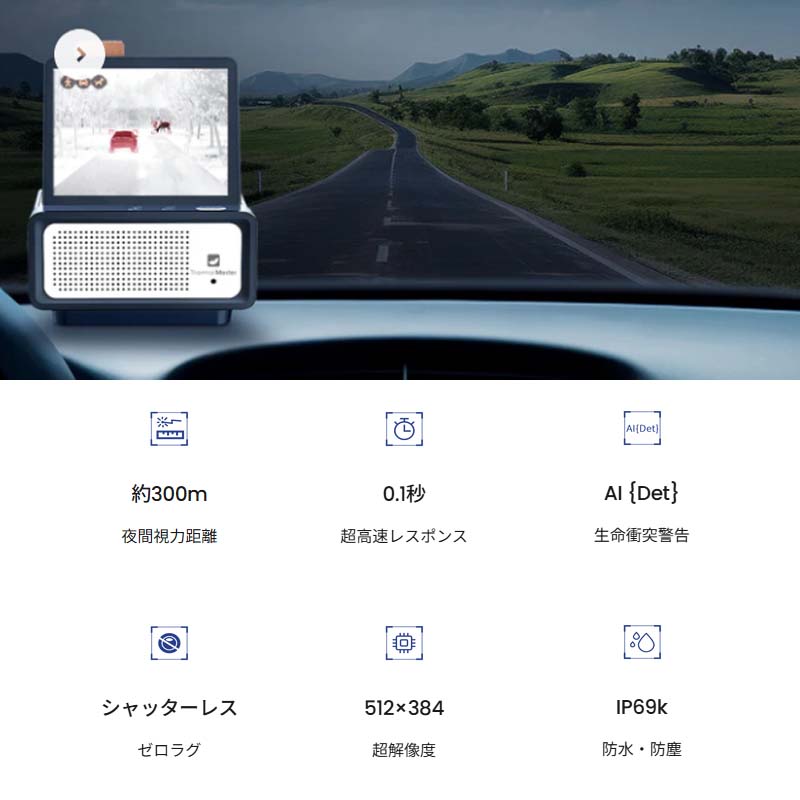 ThermalMaster「NV300MAX」は、約300mの超遠距離暗視、0.1秒の超高速応答、AI衝突警告、超解像度、WLAN機能を備えた夜間衝突防止ナイトビジョンシステムです。 【商品の特徴】 ・夜間視力距離:約300m ・高速レスポンス:0.1秒 ・生命衝突警告:AI {Det} ・ゼロラグ:シャッターレス ・超解像度:512×384 ・防水防塵:IP69k ■ハイビーム、霧、暗闇 昼夜を問わず、あらゆる天候でも、このシステムは正確な環境データを提供します。 ■高解像度の視認性 赤外線カメラと可視光カメラの両方を搭載し、鮮明な視界を実現します。 ■高度なアラート 困難な状況でも正確なアラートを発し、安全性と運転支援を強化します。 ■美的統合 デザインは車両のインテリアに調和し、機能性とスタイルの両方を高めます。 【よくある質問 質問:運転の安全を確保するためにNV300MAXが必要なのはなぜですか? 回答:Thermal MasterのNV300MAXは、高度な赤外線サーマル イメージング技術を利用して、暗い場所や悪天候でも比類のない視認性を実現します。超遠距離夜間視力機能を備えた NV300MAXは、最大300メートル先の潜在的な危険を検知できるため、十分な時間で反応し、事故を回避できます。インテリジェントな識別および警告システムにより、歩行者や車両を常に認識でき、運転全体の安全性が向上します。 質問:NV300MAXはどのようにして 300メートルの範囲を実現し、潜在的な危険を事前に警告するのでしょうか? 回答:NV300MAXには、Thermal Masterの高感度サーマルイメージングセンサーと「Razor X」Ultra Clear AIアルゴリズムが搭載されています。このテクノロジーにより、デバイスは完全な暗闇や霧やもやの中でも、最大300メートルの距離にある物体を正確に検出して識別できます。その後、システムはリアルタイムの音声と視覚による警告を発して潜在的な危険を警告し、衝突を防止してより安全な運転体験を保証します。 質問:NV300MAXは暗闇、霧、スモッグを突き抜けることができますか? 回答:はい、NV300MAXのサーマルイメージング機能により、完全な暗闇、霧、もや、煙の中も見通すことができます。これにより、人間の目が遮られてもクリアな視界が確保され、あらゆる気象条件で安全に運転するために不可欠なツールとなります。 質問:NV300MAXは、暗い場所での歩行者、自転車、動物の識別にどのように役立ちますか? 回答:NV300MAXは、7mmレンズと当社独自の超解像アルゴリズムを搭載し、画像の鮮明度を2倍に高めています。4 TOPS AIアルゴリズムは、歩行者、自転車、鹿などの動物を正確に識別し、最も暗い環境でも潜在的な危険を正確に警告します。この高度なテクノロジーにより、鮮明で詳細な画像と信頼性の高い物体認識が保証され、最大限の安全性が確保されます。 質問:NV300MAXのインテリジェント識別アラームはどのように機能しますか? 回答:NV300MAXは、100メートル以上離れた歩行者、自転車、車両を識別できる最先端の人間車両認識アルゴリズムを採用しています。システムは熱画像をリアルタイムで分析し、音と画像による警告を発して潜在的な危険を知らせます。このプロアクティブ警告システムは、2〜3秒以内に潜在的な危険を感知し、0.1秒以内にすばやく警告を発するため、反応時間が向上し、事故のリスクが大幅に軽減されます。 質問:NV300MAXはエコ運転にどのように貢献するのでしょうか? 回答:NV300MAXは視認性と安全性を向上させることで、ドライバーが最適な運転状態を維持できるようにし、事故の可能性とそれに伴う燃料の無駄を減らすことができます。また、効率的なサーマル イメージング技術により消費電力も少なくなり、より環境に優しい運転体験に貢献します。 質問:NV300MAXはビデオの保存と再生をどのように処理しますか? 回答:NV300MAXはTFカード ビデオストレージをサポートしており、運転者は自分の運転を記録して保存できます。最大64GBの容量を備えたこのデバイスでは、運転体験の詳細な記録を保持できるため、事故の調査や保険会社との共有に役立ちます。 質問:NV300MAXはリアルタイムのビデオストリーミングをどのようにサポートしますか? 回答:NV300MAXには、個人のスマート デバイスへのリアルタイムビデオストリーミングを可能にする WiFiモジュールが搭載されています。この機能により、ドライバーはスマートフォンやタブレットでライブの熱画像フィードを確認できるため、利便性と安全性がさらに高まります。 質問:NV300MAXの反応時間はどれくらい速いですか? 回答:NV300MAXは、高度なアルゴリズムでリアルタイムに処理および警告を発し、迅速な対応を実現するように設計されています。2〜3秒以内に潜在的な危険を感知し、0.1秒以内に警告をすばやく発信します。この迅速な反応時間により、ドライバーは必要な情報を入手して即座に判断することができ、安全性が大幅に向上します。 質問:NV300MAXのインストールは簡単ですか? 回答:NV300MAXは、最小限のセットアップで簡単に設置できるように設計されています。わかりやすい説明書と