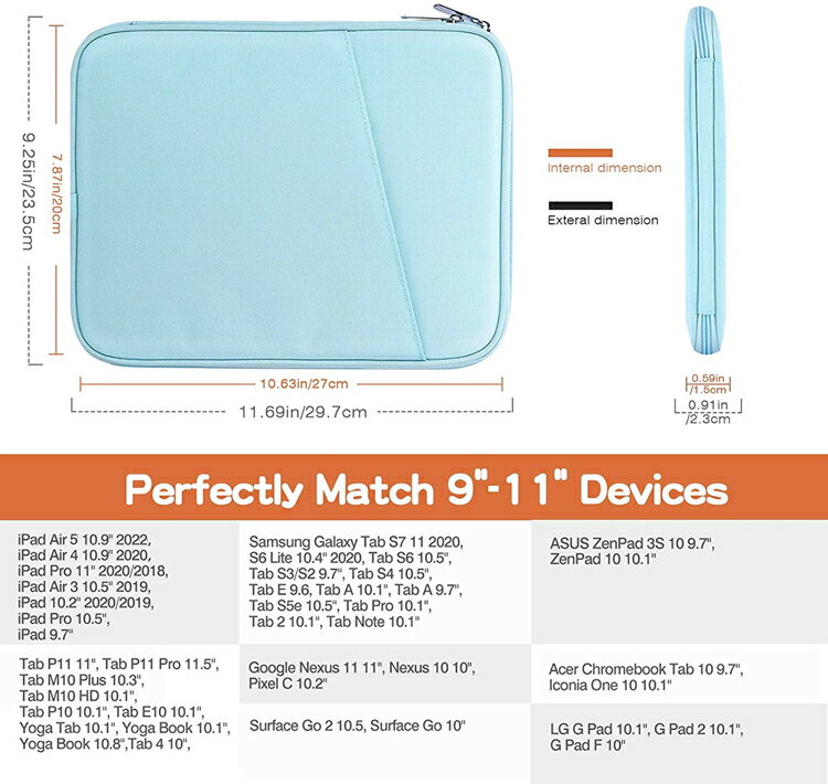 仕様: ★外寸:29.7cm x 23.5cm x 2.3cm ★内寸:27cm x 20cm x 1.5cm 重さ:130g ポケット数:4 材質:ポリエステル繊維&起毛素材 【サイズの選びについて】 ※ご購入前、ご利用のPCのサイズをご確認してください。 ※ご利用のPCの寸法よりバッグの内寸が1cm以上大きいサイズをお選びください。 ※ご利用のPCの厚さが2cmまたはそれ以上の場合、ワンサイズ大きめのサイズをお勧めします。 ※ご利用のPCのインチ表記と同じサイズのバッグの場合、本体の厚さによってキツくなる恐れがあります。 ※サイズはあくまでも目安でございます。手作業でサイズを測っておりますので、1~2cmの誤差が生じる場合がございます。ご了承の上ご注文下さい。 商品説明: ●「対応機種」9〜11インチまでのノート・タブレットPCに適用します。ご購入の際に、機種とサイズをご確認いただきようお願い致します。 ●「撥水加工」 表面には耐摩擦性・丈夫な高密度ポリエステル生地で生活撥水できます。一般的な小雨などで中の荷物が濡れてしまう心配はございません。多少の汚れならふき取れば簡単に落とせます。雨や雪による水が染み込まないので貴重なラップトップと周辺機器を水濡れから防ぎます。 ●「しっかり保護」 表面生地は撥水加工された600Dプレミアムポリエステル素材を使用していて、すっきりと洗練された印象を与えます。裏地は柔らかい起毛素材を採用しており、適切なクッションが衝撃を軽減および吸収し、毎日の衝突、落下、衝突からしっかり保護します。 ●「収納力抜群」 バッグには、ダブル仕切りポケットがあり、メイン仕切りポケットにタブレットを収納できます。フロントポケットに周辺機器、ペンケーブル、充電器、携帯、名刺カードなどの小物を入れます。収納力がとても抜群で荷物をあまり持ちたくない外出の際も便利です。 ●「ファスナー式開閉」 開閉しやすいファスナーを採用し、簡単に取れたり割れたりしないので安心感があります。老若男女を問わず、サラリーマン・ビジネスマン・学生に最適、出張、ビジネス、通勤、通学、アウトドア、防災などの様々な場合に適用して、お好みの向きで使用できます。 ご注意: 1. 本製品は一部防水加工です。大雨、豪雨等の場合は濡れる恐れがあるので、使用にはご注意ください。 2. 写真の色と実際の商品は、照明効果により多少異なる場合があります。 3. 9〜11インチまでのノート・タブレットPCに適応致しております。ご購入の際に、機種とサイズをご確認いただきようお願い致します。 4. ご利用時は、アクセサリーまたは保護用ケースを装着した状態で収まりにくいです。アクセサリーまたは保護用ケースを外してタブレット本体のみを入れて使いのをおすすめします。 〜一部の対応機種〜 Apple iPad 第11世代(A16) 2025 iPad 第10世代 10.9 2022 iPad Air/Pro 11インチ(M3/M2) iPad 10.2インチ 第9/8/7世代、iPad 9.7インチ 第5/6世代、iPad 1/2/3/4 iPad Air 5 (第5世代) 10.9 インチ 2022,iPad Air 4 (第4世代) 10.9 インチ 2020 , iPad Air 3 (第3世代) 10.5 インチ 2019、iPad Air 2/Air iPad Pro 11 インチ 2021/2020/2018、iPad Pro 10.5、iPad Pro 9.7インチ Microsoft Surface Surface GO3 / GO2 / GO; Huawei Mediapad T5 10/ M5 Pro/ M5 lite 10 10.1インチ/ M3 Lite 10など。 Samsung Galaxy Galaxy Tab A9+ 11 ご不明やご使用中に不具合ことがございましたら下記の連絡方法で弊社にご連絡ください。 1.弊店の「会社概要」→「ショップへの問い合わせ」(または商品ページの「商品についての問い合わせ」)をご利用ください。 2.メールで弊店へご連絡お願いします。 【注意事項】 ・当店の商品は全て国内から配送されます。 ・国内配送の商品は国内でのお買い物と同じく消費税が発生いたします。関税はかかりません。 ・色がある場合、モニターの発色の具合によって実際のものと色が異なる場合がある。【 ✿ 9~11インチタブレットバッグ オススメ✿ 】 タブレット バッグ 9-11インチ 耐衝撃 クッション iPad Air 4 Pro 11 2021 Surface Go 2 Chormebook 10.1 タブレット ケース バッグ MediaPad DragonTouch ノートパソコン PC バッグ 取っ手付き 持ち運び便利 おしゃれ 通学 ビジネス1,880円 (税込) 送料込 タブレット バッグ 9-11インチ iPad mini 6 2021 ショルダーバッグ pc ケース バッグ かわいい 大容量 iPad Air 3 4 pro 11 surface go 2 Lenovo Chromebook Duet Vankyo kindle 10 汎用 撥水 耐衝撃 小学生 子供 キッズ リモート 学習 1,680 (税込) 送料込 タブレット PC バッグ 9-11インチ クッション iPad 8 Air4 Pro 11 2021 Surface Go 2 ケース バッグ Vankyo MediaPad IdeaPad Duet Chromebook 10.1 10インチ タブレット ケース バッグ 耐衝撃 撥水 多機能 仕切り オシャレ かわいい 子供 ランドセル 小学生 中学生 リモート 1,680円 (税込) 送料込 スリーブケース パソコンケース 9~13.5インチ ノートパソコン ラップトップ ケース バッグ ipad pro 11/12.9 2021 surface Pro 7 go 2 MacBook pro Air 13 13.3 iPad 8 Air4 タブレット ケース バッグ 10 11 13.5 pcケース おしゃれ かわいい ランドセル 980円 (税込) 送料込