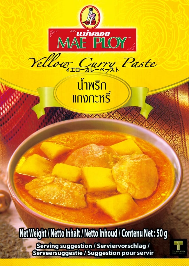 ■イエローカレーペースト [50g] 〔MAE PLOY〕の詳細 ブランドMAE PLOY(メープロイ)名称イエローカレーペースト原材料名にんにく、レモングラス、食塩、シャロット、ナンキョウ、唐辛子、コリアンダー、こぶみかんの皮、カレーパウダー、クミン、シナモン、ターメリック、カルダモン、ナツメグ内容量50g原産国名タイ保存方法直射日光、高温多湿を避け、常温で保存して下さい。開封後は、冷蔵庫で保存の上、なるべくお早めにお使い下さい。備考こちらの商品には、一部に日本語表記が使われている場合がございます。賞味期限2026年11月14日かそれ以降の商品をお届けします大ロットでのご購入について飲食店様、雑貨店様など、業務用の数の多いご注文も大歓迎です。在庫がある分は即納できます。配送についてあす楽について■濃厚で豊潤なカレー イエローカレーはタイ語で「ゲーン・ガリー」と言われています。イエローカレーは、タイの素材とインドのスパイスが融合したカレーでターメリックの黄色から、諸外国で「イエローカレー」と呼ばれるようになりました。イエローカレーは、他のタイカレーでも使用されているココナッツミルクに加えてより濃厚なココナッツクリームを使用することが多く、じゃがいもを多用することもあって、他のカレーと比べて豊潤でクリーミーな味わいがあるのが特徴です。またココナッツにより香辛料特有の風味や辛味が抑えられ、タイ国外の人々には特に好まれるています。多くの場合は白飯か細いライスヌードルとともに食べられています。濃厚でマイルド、見た目に美しいイエローカレーを是非お試し下さい。 ■お手軽小サイズこちらは、50g入の小サイズです。一袋で約3〜4人分のイエロー カレーを作ることが出来ます。試しに作ってみたい、色々なタイカレーを作ってみたい、小分けの方が保存に便利と!言う方におススメです。たくさん食べたい、イベントの出し物でたくさん作る、レストラン様で大量に使いますと言う方に便利な400gポット入りの大サイズ(約30人分)のものもありますのでそちらをお試しください。約30人分(400g) イエロー カレー ペースト【MAE PLOY】 ■調理方法(約3〜4人分)◎材料 イエローカレーペースト 50g ココナッツミルク 400ml 肉 200g じゃがいも 100g 玉ねぎ 100g ナンプラー 少々 ※野菜、肉はお好みのものを300g〜400gほどご用意ください ◎作り方 1.中華鍋、又は鍋にサラダ油を入れて熱し、カレーペーストを炒めます。 2.香りがたってきたらココナッツミルク400mlを加えて油分が分離して浮いてくるまで煮込みます。 3.ひと口大に切った肉、玉ねぎ、じゃがいもを加え、肉に火が通るまで煮込みます。 4.水200ccを足して軽く煮込んで、ナンプラーで味を整えて出来あがり
