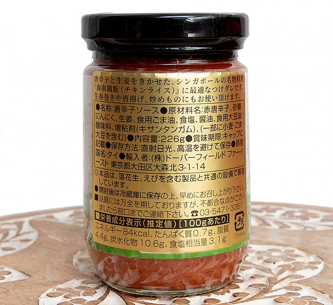 ■海南チキンライスのタレ - シンガポールチリソース - 海南鶏飯香辣醤 - SINGAPORE CHILLI SAUSE【CLASSIC THAI】の詳細 ブランドCLASSIC THAI(クラッシックタイ)原材料・成分赤唐辛子、砂糖、にんにく、しょうが、食用ごま油、醤油/酸味料、増粘剤(キサンタンガム)、 (一部に小麦・ごま・大豆を含む)名称唐辛子ソース商品の内容量226グラム温度帯指定常温: 開封前は室温での保管が可能ですハラルイスラムの方でも安心のハラル食品です。容器の種類瓶製造国タイおことわり直射日光を避け保存してください。開封後は、冷蔵庫に保管してお早めにお召がり下さい。食品の状態ペースト商品サイズ約11cm x 6cm x 6cm 約430g賞味期限2027年01月30日かそれ以降の商品をお届けします配送についてあす楽についてクーポンプレゼントキャンペーンについてこちらの商品は「商品レビューで200円OFFクーポン プレゼント」キャンペーンの対象商品です。以下の画像をクリックで、キャンペーンの詳細ページをチェック!美味しい漬けダレ、シンガポールチリソースです。蒸しどり、カオマンガイ、海南チキンライスはもちろん、炒めものや唐揚げサラダにとアイデア次第で使い方は幾通りです。現地の調味料を使えば、現地の味を忠実に再現出来ますよ?。あたりまえかぁ・・・手に持ってみました。野菜の和え物等にも使えます。是非、お試しください。 ■海南チキンライスのつけダレ 生姜とにんにく、酸味を加えたクラッシュタイプのキレのあるチリソースです。 海南鶏飯、カオマンガイの蒸し鶏のつけダレや生春巻きや春雨サラダ(ヤムウーセン)などのソースとしてお勧めです。 また 炒め物などに加えると生姜の香りとチリソースの辛味が食欲をそそります。 ■使い方 海南鶏飯、カオマンガイの蒸し鶏のつけダレに。生春巻きや春雨サラダ(ヤムウーセン)などのソースとして。炒め物の隠し味などに