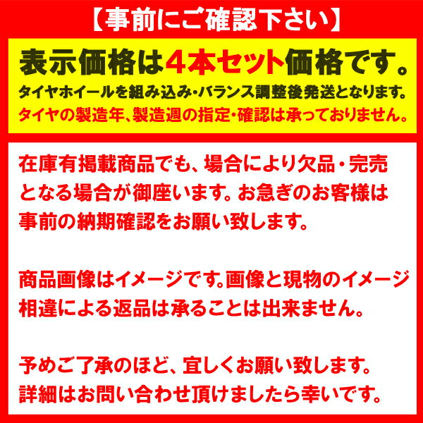 商品分類 タイヤ(新品)+ホイール(新品) 商品説明 こちらの商品は4本セット価格となります。 無料にてアルミホイール&タイヤ組付・バランス調整後発送致します。 製造年数・製造国はお選びできません。ホイール重量もお答えしておりません。予めご了承下さい。 出品店舗 格安タイヤショップ トレッド 毎週土・日曜日(夏季・年末年始休業)定休日 営業時間 平日 AM10:00〜PM17:00 メールアドレス tire_shop_tread@tread-tire.jp タイヤ詳細 タイヤ:グットイヤー ICE NAVI CARGOサイズ:195/80R15 107/105L製造年:2025年 ホイール詳細 対象ホイール:商品画像を参照いただきお選びください。 サイズ:6.0J×15 インチ INSET:+33 PCD:6H139.7 CAP:有り 専用ナット:無し 適合車種 【トヨタ】ハイエース(200系)[3BA-TRH214W/3BA-TRH224W/3BF-TRH200K(ジャストロー除く)/ 3BF-TRH200V(ジャストロー除く)/3BF-TRH211K/3BF-TRH221K/3DF-GDH201K(ジャストロー除く)/ 3DF-GDH201V(ジャストロー除く)/3DF-GDH211K/3DF-GDH221K/CBA-TRH214W/CBA-TRH224W/CBF-TRH200K(ジャストロー除く)/ CBF-TRH200V(ジャストロー除く)/CBF-TRH211K/CBF-TRH221K/LDF-KDH211K/LDF-KDH221K/QDF-GDH201K(ジャストロー除く)/ QDF-GDH201V(ジャストロー除く)/QDF-GDH211K/QDF-GDH221K/QDF-KDH201V(ジャストロー除く)] レジアス エース[ADF-KDH211K/ADF-KDH221K/CBF-KDH211K/CBF-TRH211K/CBF-TRH221K/LDF-KDH211K/LDF-KDH221K]等に■適合車種に付いて年式や、グレード、カスタム状態によって異なります。※『確実に装着可能』と言う訳では御座いません。予めご了承下さい。車検の合否、ツライチに関しましては、個体差や個人差(検査員)によって異なりますので、当店として出来る限りのお答は致しますが、最終的な判断は御自身にてお願い致します。※確実な装着・車検、点検等をお約束するものでは御座いません。 お支払方法 お支払方法は、楽天決済・Edy決算・銀行振込・代引きからお選び頂けます。時間帯指定は以下の時間帯よりお選び頂けます。午前中、12時〜14時、14時〜16時、16時〜18時、18時〜20時、19時〜21時※地域によっては、時間帯指定をご利用頂けない場合もございます。ご不明な場合はお調べ致しますので、お気軽にお問い合わせ下さい。代引手数料は以下の通りとなります。 10,000円迄:330円(税込)円 30,000円迄:440円(税込)円 100,000円迄:600(税別)円 300,000円迄:1,100円(税込) お支払総額 お支払総額は、商品代金+送料+(代引手数料)となります。振込手数料等はご客様負担となりますので、予めご了承下さい。 発送について 商品ページに設定されている配送予定、または指定日時に向け順次出荷いたします。 在庫に関して 当店は、複数のサイトや店頭販売で在庫を共有している為、ご注文のタイミングで在庫にずれが生じ、ご注文頂いた商品が売切れとなる場合がございます。その場合はメールでご連絡させて頂きます。予めご了承下さい。 店頭作業 店頭でのタイヤ交換も承っております。工賃等に関しましては、お気軽にお問い合わせ下さい。 領収書 領収書の発行も可能ですので、ご希望の際はオーダーフォームにご入力下さい。※代引きの際はご利用頂けませんので、予めご了承下さい。 コメント 当店の商品をご覧頂き誠に有難うございます。ご質問等ございましたら、お気軽にお問い合わせ下さい。また、店頭での現物確認も出来ますので、お気軽にご来店下さい!中古のホイールでしたら、無料にて試着もできます!
