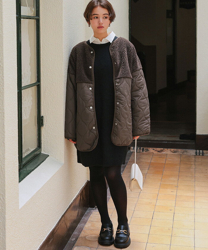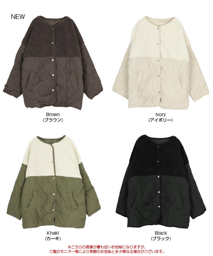 【店内全品20%OFFクーポン】11/27 1:59まで■ボア切替キルティングショートコート アウター レディース コート ショート丈 ノーカラー ボタン ポケット 中綿 カジュアル シンプル