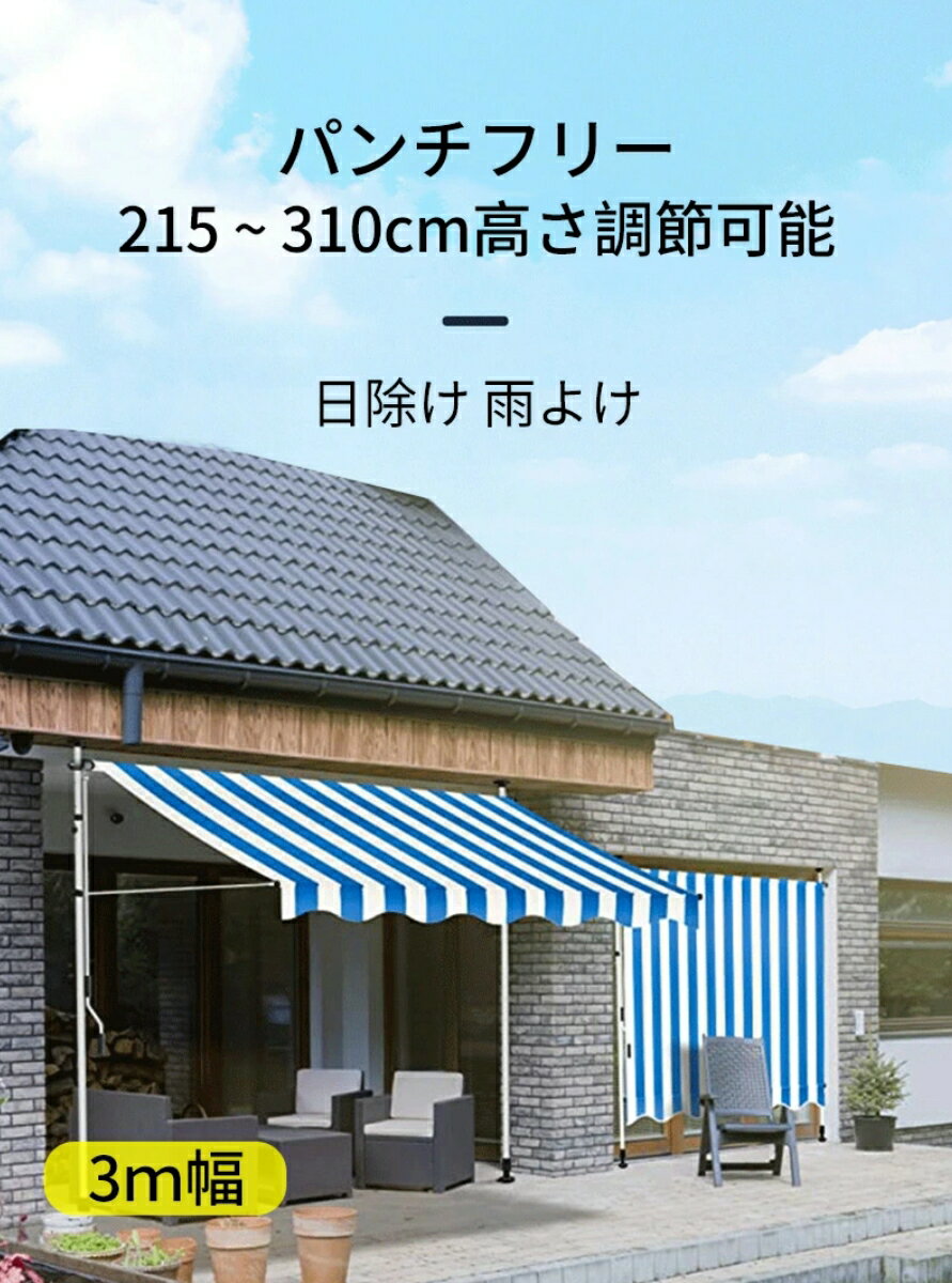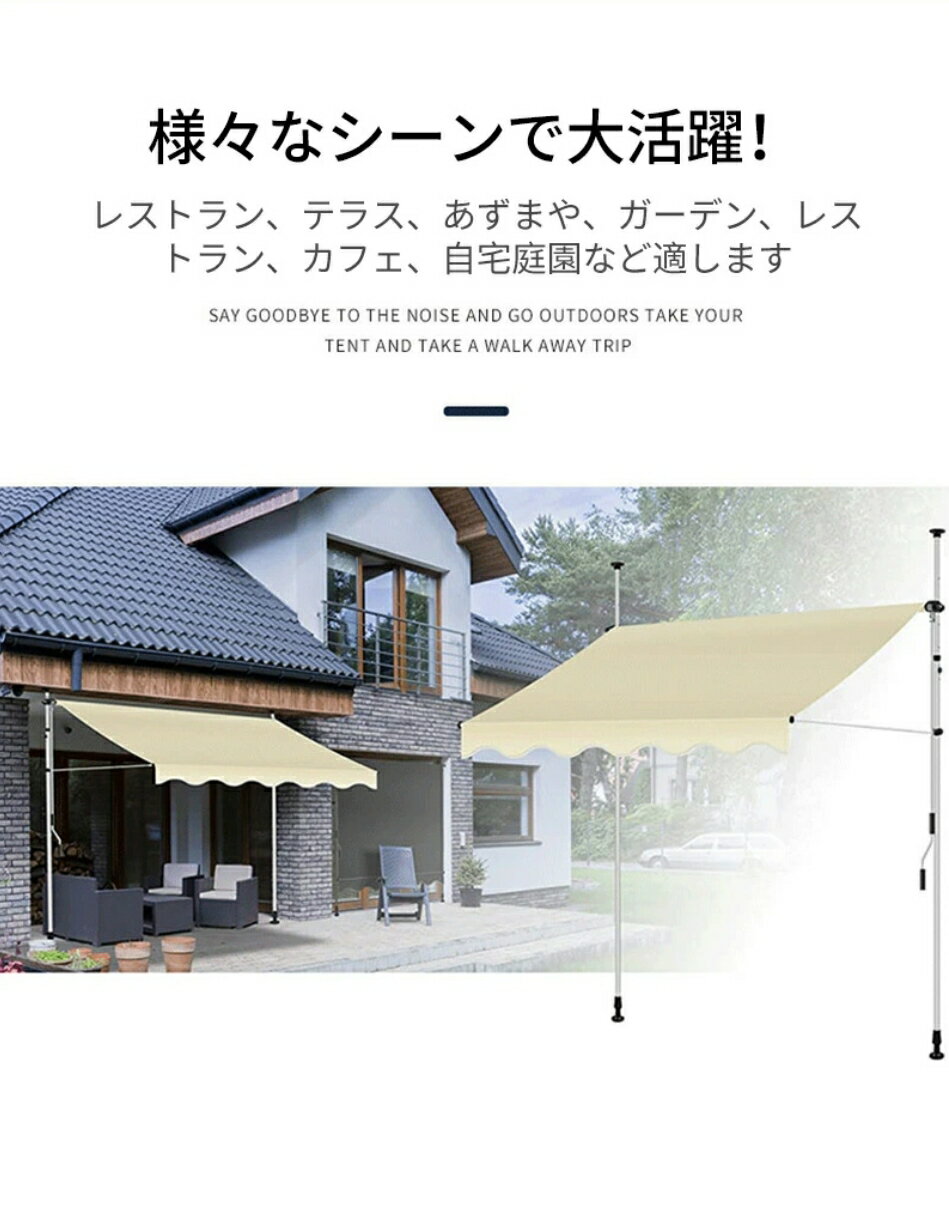 【耐久性、耐候性の高いターポリンキャンバス生地を採用】 ポリエステルの織物に塩化ビニールを貼り合わせたもので、軽量で強度が高いと言われています。 また、撥水加工もされており、雨にぬれても水を弾くので、雨濡れする心配はありません。 お手入れもサッと拭くだけで簡単です。 【シェードの角度を自由に調節 シェードの角度調節は壊れにくいクランク式を採用しています。自由に調節でき目隠しにもなります。シェードの取り付け位置も無段階で調節可能です。 【堅牢な構造】当社の防水オーニングの鉄骨フレームは非常に強く、防錆コーティングで覆われているため、安定して長期間使用できます。 足元は滑りにくく安全です。 【家庭用およびビジネス用】屋外の日よけシェルターキャノピー、パティオの日よけは、窓の日よけ、バルコニー、中庭、パティオ、カフェ、バックポーチのあるレストランに最適で、紫外線から保護し、空間をエレガントに見せます ▲テント オーニング UVカット率95%以上 日よけ シェード 幅250cm サンシェード ベランダ テント ベランダテント 日除け 雨よけ 紫外線 撥水 UVカット クールサマーオーニング 巻き上げ式テント 簡単設置 複数カラー選択可能 ツッパリ式 パンチフリー テント オーニング オーニングテント オーニング つっぱり オーニング つっぱり式 オーニング 自立 オーニング 2.5m オーニング 防水 オーニング ひさし オーニング テント シェード オーニングテント 2.5m オーニングテント 取り付け ▲テント オーニング UVカット率95%以上 日よけ シェード 幅200cm サンシェード ベランダ テント ベランダテント 日除け 雨よけ 紫外線 撥水 UVカット クールサマーオーニング 巻き上げ式テント 簡単設置 複数カラー選択可能 ツッパリ式 パンチフリー ※注意事項 サイズ・重量は、多少の誤差が生じる場合がございます。 お使いのブラウザや設定により、画像と実際の商品との若干の色の違いが生じる場合がございます。予めご了承いただけますようお願いいたします。 沖縄にお住いの方は別途送料2000円掛かる場合があります。