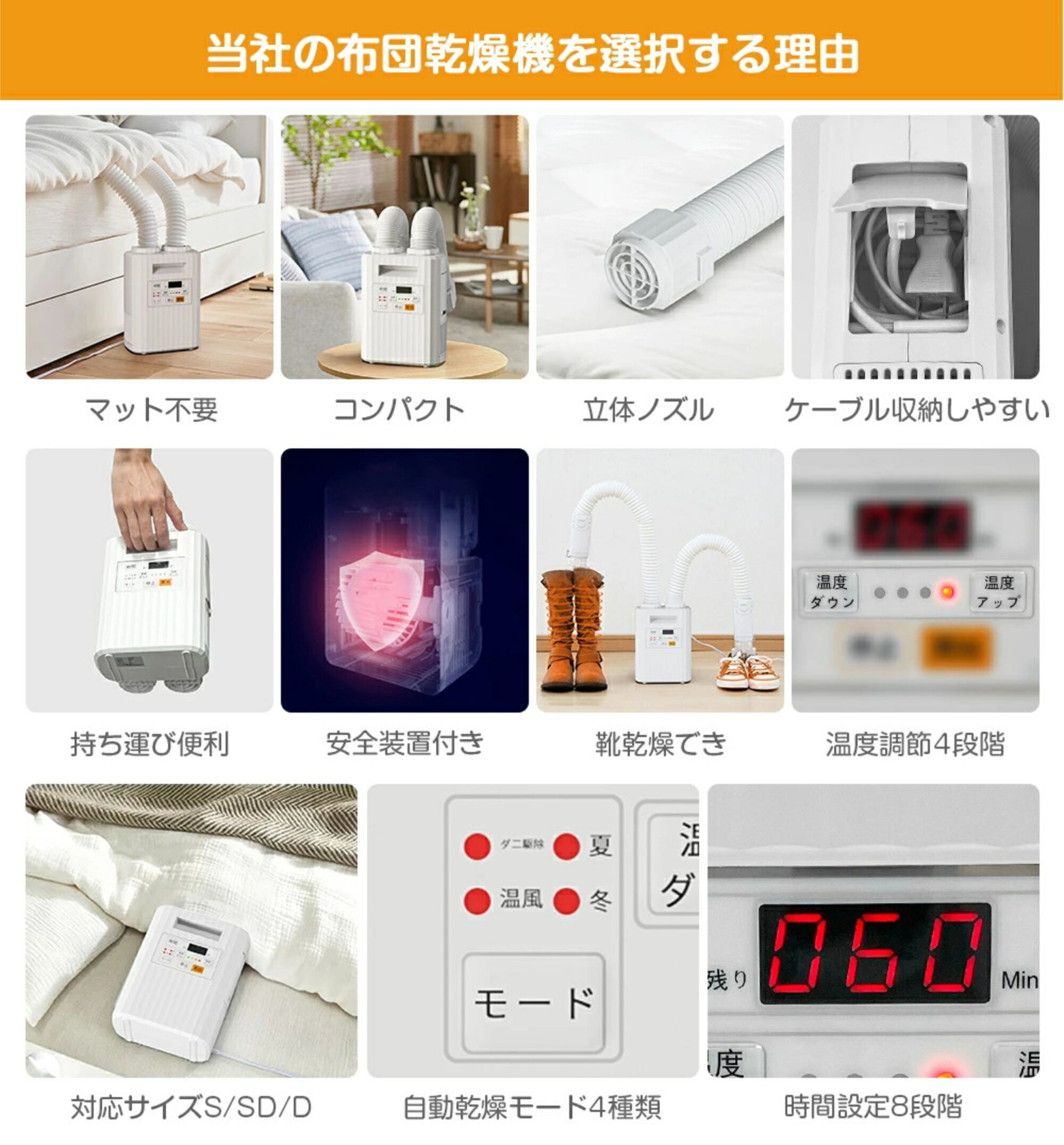 温風でふとんをあたため、湿気とカラリととばせる「ぽかぽか」へ~ツインノズルだから2つの布団も一気に同時あたため&乾燥! 【自動乾燥モード4種】1あたためモード:冷えた布団を短時間であたため。寝る前の使用がおすすめです。2冬モード:あったか温風仕上げ。布団を温め、ふんわり仕上げます。3夏モード:さわやか送風仕上げ。温風でカラッと乾燥。さわやかな風で熱気を逃します。4ダニ駆除:約50°C以上の温風でダニ退治!天日干しができない時期でも布団を清潔に保つことができます。※ダニは50°C以上の高温で30分以上加熱すると死滅するといわれています。 【加熱されすぎない3種の保護機能】1温度センサー:温度を測定してデータを提供する機能。2サーモスタット:設定温度より高くなりすぎると電源をカットする機能。3温度ヒューズ:発熱を感知して保護する機能 【便利な靴乾燥】付属のアタッチメントを取り付けることで、2足を一気に乾燥できます。スニーカーやブーツ、革靴にも対応!※本革や合皮、ビニール製など耐熱温度の低い素材の場合、「送風モード」を使用ください。 布団乾燥機 ツインノズル ダニ対策 コンパクト 小型 軽量 おしゃれ 衣類乾燥 温風 靴 乾燥 部屋干し 速乾 速暖 オールシーズン 梅雨 湿気対策