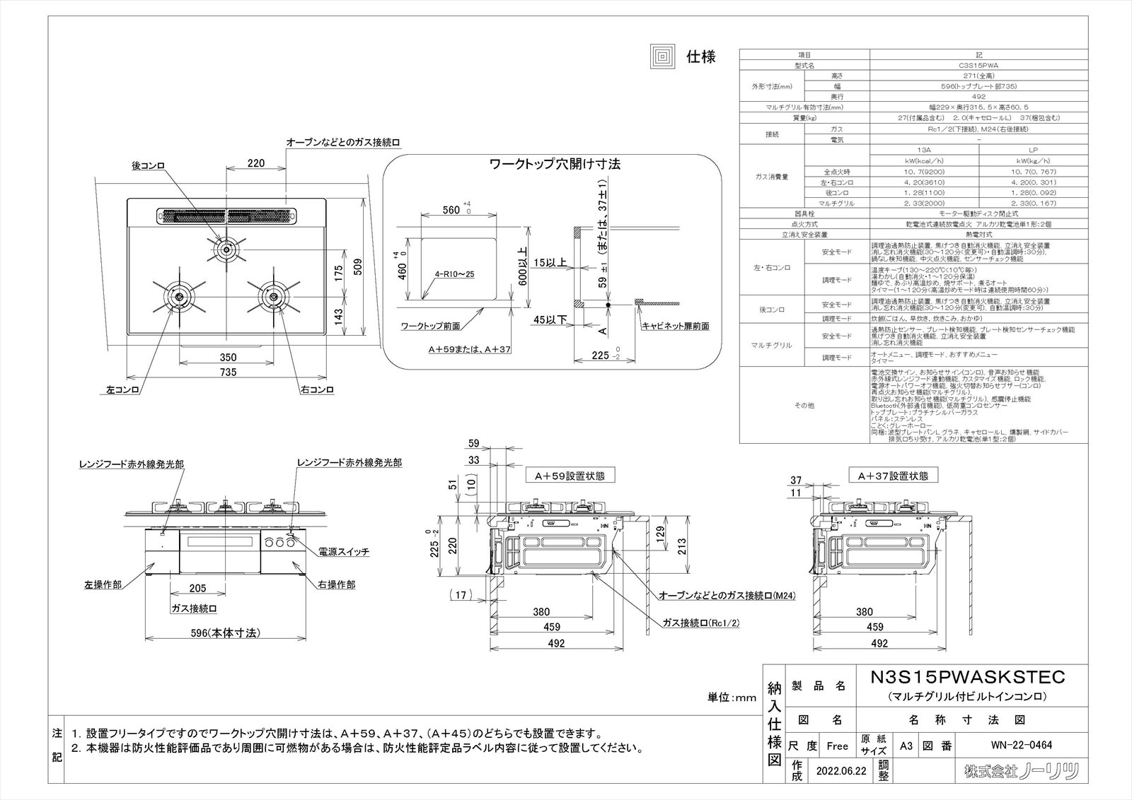 メーカー希望小売価格はメーカーカタログに基づいて掲載しています基本スペック ブランドノーリツ 製造元ハーマン 開口寸法W560mm×D460mm 機器高さ220mm トッププレート種類ガラス(プラチナシルバー) トッププレートサイズ750mm 親水アクアコート トッププレート備考親水アクアコート ゴトクホーロー フェイスシルキーステンレス コンロ数3 コンロバーナーW高火力 グリル(種類)マルチグリル グリル(サイズ)ワイド ガス配管接続位置左後方 ガス接続口(下)Rc1/2(メネジ) オーブン接続口(後方)M24クイック 外形寸法H271mm×W596mm×D492mm グリル有効寸法H73mm×W229mm×D313mm