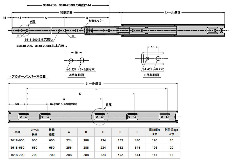 商品詳細 メーカー スガツネ工業 LAMP 品番 3618-600 仕上げ 光沢クロメート処理 サイズ レール長さ600mm×幅36mm 商品名 3618シリーズ 36幅3段引きスライドレール 横付けタイプ 備考 2本1組での販売です。インナーレールを完全に引き出せる3段引きのスライドレールです。レールを全閉にした時、閉じた状態を保持する簡易的なキャッチ機能付きです。レバー操作でインナーレールを取り外せます。脱着レバーは左右兼用です。レールを全開にすると、摩擦抵抗によりブレーキがかかり止まります。さらに強く引くとレールが抜け、脱着が可能です。 注意 ●インナーレールとアウターレールの組み合わせは変えないでください。●耐荷重表記は、引き出し側レールを伸ばした時のレール中央部での静止荷重です。 推奨ねじ※ねじは付属しておりません。 M4バインドねじスガツネ工業 3618-600 スライドレール / レール長さ600mm×幅36mm ▼ スライドレール カテゴリー別 サイズで選ぶ / 色で選ぶ / 型番で選ぶ 3618型 サイズで選ぶ 3618-150 3618-200 3618-250 3618-300 3618-350 3618-400 3618-450 3618-500 3618-550 3618-600 3618-650 3618-700 3618型 カラーで選ぶ シルバー ブラック