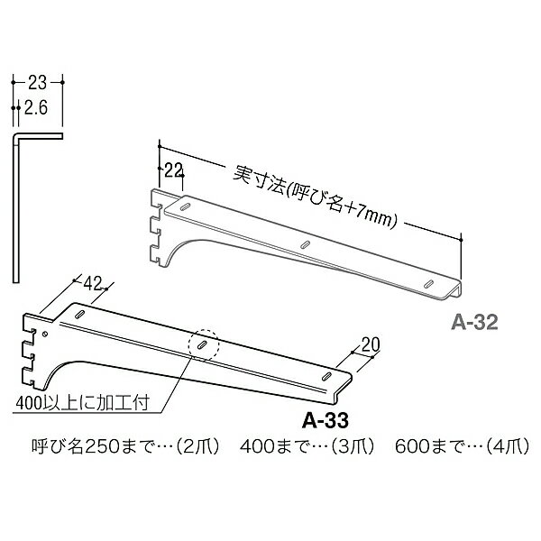 商品詳細 カラー クローム メーカー ロイヤル 品番 A-32・A-33 長さ 300mm 入り数 A-32…1本A-33…1本(左右1組) 特徴 ロイヤルチャンネルサポート用の木棚板用ブラケットです。ビス穴があいており、棚板とブラケットを固定できます。ウッドブラケットA-32、A-33のセットでの販売となっています。 ※ご注意※ 棚柱・ビスは別途お買い求め下さい。A-32/33(クローム) ウッドブラケット 各種 150mm 200mm 250mm 300mm 350mm 400mm 450mm ASF-1(クローム) チャンネルサポート(棚柱)各種 600mm(×1本) 900mm(×1本) 1200mm(×2本) 1500mm(×2本) AT-P(クローム) 棚柱取付ビス 各種 20mm(50本入) 25mm(50本入) 30mm(50本入) 40mm(50本入) 50mm(50本入)