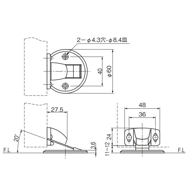 商品詳細 カラーバリエーション ブラック/アンバー/シルバー/ホワイト/ゴールド 品番 DMF-11 商品名 フラット戸当り(マグフラ戸当り) 材質 本体:PA6ナイロンキャッチプレート:S55C鋼板 付属ビス 本体:鉄トラスタッピング 3.5×20受座:鉄皿タッピング 4×25※頭は本体と同色 適正取付範囲 床から8mm〜14mm 磁力 2000ガウス 特徴 受部面付タイプで床面にスッキリ設置でき、扉がマグネットで止まる戸当りです。受(床側)は面付けタイプで床面加工は不要です。固定式戸当りに比べて突起が少なく、バリアフリー仕様です。キャッチ機能付で立ったままアオリ止め操作が可能です。本体取付位置が簡単にわかるゲージ付です。 ご注意 本体の取り付け寸法は、キャッチ機能付ですので特に正確に出してください。