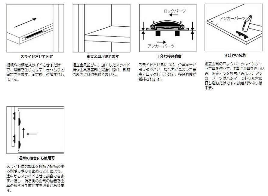 商品詳細 メーカー Lamello (ラメロ) 品番 145570 商品名 デバリオ(Divario)P-18 P-システム・スライドクランプ方式 入り数 1000組 「デバリオ(Divario)」P-システム・スライドイン クランプ方式 組立金具の特徴 【スライドさせて固定】棚板や桁板をスライドさせるだけで、隙間を生じさせずにきっちりと固定できます。固定後、位置ずれしません。【組立金具が隠れます】組立金具並びに、加工したスライド溝や金具装着部も完全に隠れ、部材の表面には何も残りません。【十分な接合強度】スライドさせるにつれ、金具同士が引っ張り合い、接合力が高まった時点でロックしますので、接合強度が維持されます。【すばやい装着】組立金具のロックパーツはインサート工具を使って、T溝に金具を差し込み、固定ピンを打ち込みます。アンカーパーツはハンマーでドリル穴に打ち込むだけです。接着剤やネジは不要。【通常の接合にも使用可】スライド溝の加工を棚板や桁板の後ろ側ギリギリで止めることにより、途中からスライドさせて接合できます。但し、後ろ側の金具の位置を金具の長さ分手前にする必要があります。 関連商品 ※ゼータP2本体は別売りです。【送料無料】ラメロ [ ZETA-P2 ] ゼータP2 Pシステム専用 加工機本体 ZETA P2 Lamello 組立家具 P-システム組立金具装着部の専用加工機 家具 組立 加工機 本体 取寄せ商品について ※お取り寄せ商品のため、ご注文確定後(決済確定後)のメーカー手配となります。※納期の目安はメーカー在庫時です。万が一欠品中の場合は、別途ご連絡差し上げます。※商品の特性上、ご注文確定後のキャンセル・返品・交換はお受けできません。