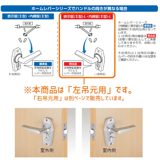 商品詳細 メーカー 川口技研 / GIKEN 商品名 ホームレバー 表示錠 品番 HL-4-L 仕上げ N(ニッケル) / CB(塗装ブラウン) 機能 室内側:内カギ付き / 室外側:赤・青 表示器付き 対応ドア厚 29mm〜45mm バックセット 35mm / 50mm / 60mm 左右勝手 左吊元用 ※特注タイプ ●右吊元用は別ページで販売しております。 関連商品 【 ホームレバー 各種 】 ●ホームレバー HL-1 バックセット 空錠(N/CB) ●ホームレバー HL-2 戸襖錠(N/CB) ●ホームレバー HL-3 内締錠(N/CB) ※右吊元用 ●ホームレバー HL-4 表示錠(N/CB) ※右吊元用 ●ホームレバー HL-4-L 表示錠(N/CB) ※左吊元用