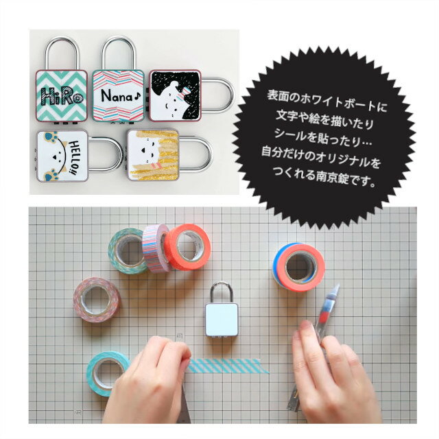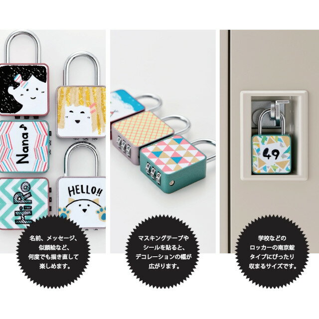 商品詳細 メーカー TANNER / 和合商事(田邊金属工業所) 商品名 キャンバスロック(デザイン南京錠) 品番/色(カラー) CL-S(シルバー)/ CL-R(ワインレッド)/ CL-G(グリーン) 商品説明 南京錠本体の表面がホワイトボードになっているので、文字や絵を描いたり、シールを貼ったり、自分だけのオリジナル南京錠を作れます。 名前やメッセージ、似顔絵など、何度でも描き直して楽しめます。 マスキングテープやシールを貼ると、デコレーションの幅が広がります。 可変ダイヤル錠仕様の為、お好きな解錠番号の設定が何度でも可能です。 用途学校・会社・工場・施設などのロッカーの南京錠タイプに最適!(ぴったり収まるサイズです。) 使用上の注意商品本来の用途以外には使用しないで下さい。 新たに設定した番号は、必ず記録して下さい。 番号を忘れた場合の解錠は不可能です(切断するしかありません)。 番号設定時に以外に、番号設定ボタンを押さないで下さい(解錠する事が出来なくなります)。 防犯対策として、万全ではございません。 万が一、事故やトラブルが発生しても、当社は一切の補償、弁償などは行いませんのであらかじめご了承下さい。 材質(本体) 亜鉛ダイカスト 材質(吊)鉄+クロムメッキ ツル部寸法(ツル径×W(内径)×H(内径))Φ3.8×20×17mm 本体部寸法(W×H×D) 35×35×16mm 取寄せ商品について ※お取り寄せ商品のため、ご注文確定後(決済確定後)のメーカー手配となります。 ※納期の目安はメーカー在庫時です。万が一欠品中の場合は、別途ご連絡差し上げます。 ※商品の特性上、ご注文確定後のキャンセル・返品・交換はお受けできません。