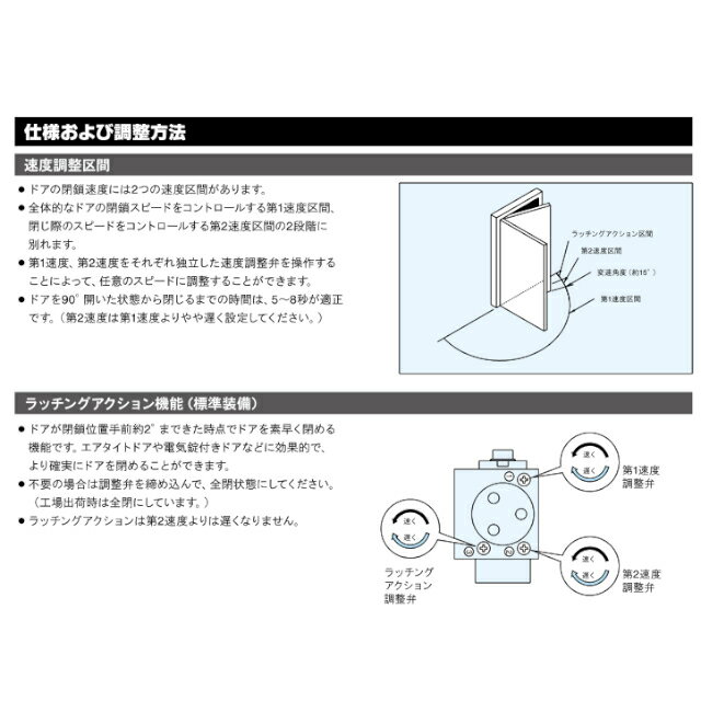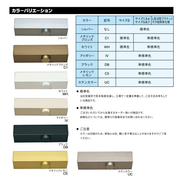 商品詳細 メーカー リョービ / RYOBI 品番 S-1001P 商品名 1000シリーズ ドアクローザー 仕上げ 標準色:SV(シルバー)準標準色:C1(メタリックブロンズ) / WH(ホワイト) / DB(ブラック) / IV(アイボリー) / C(メタリックレモン) / UC(ステンカラー) 仕様 パラレル型 / 外装式ストップ / 標準ブラケット / 標準アーム 適用ドアサイズ 幅800mm×高2100mm 適用ドア重量 15kg〜30kg お知らせ ●全機種とも左右勝手共用です。●機種選定の際は、摘要ドア幅を優先してください。●スタンダード型とパラレル型では本体が異なります。●風当たりの強い場所には、1サイズ大きい機種をご使用ください。●1番〜3番サイズはオールシーズン対応品です。 取寄せ商品について ※お取り寄せ商品のため、ご注文確定後(決済確定後)のメーカー手配となります。※納期の目安はメーカー在庫時です。万が一欠品中の場合は、別途ご連絡差し上げます。※商品の特性上、ご注文確定後のキャンセル・返品・交換はお受けできません。