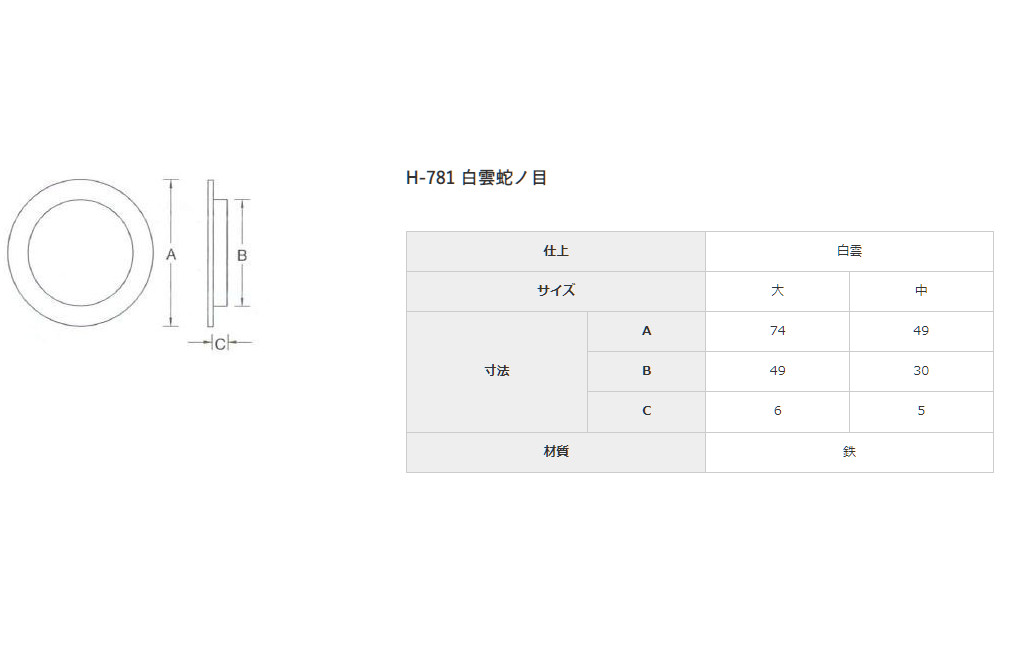 商品詳細 メーカー ヤマイチ(YAMAICHI) / 山口安製作所 商品名 H-781 白雲蛇ノ目 襖引手 サイズ 大(穴径49mm) / 中(穴径30mm) 仕上げ 白雲 材質 鉄 販売単位 1枚 取寄せ商品について ※お取り寄せ商品のため、ご注文確定後(決済確定後)のメーカー手配となります。 ※納期の目安はメーカー在庫時です。万が一欠品中の場合は、別途ご連絡差し上げます。 ※商品の特性上、ご注文確定後のキャンセル・返品・交換はお受けできません。