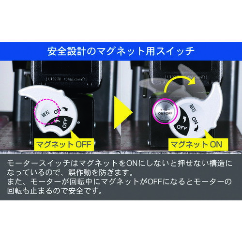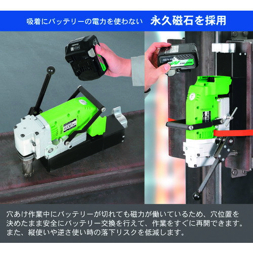特長:電源いらずで様々な現場に対応可能なコードレスタイプです。DC36Vモーターを搭載しています。超軽量8.8kgです。吸着にバッテリーの電力を使わない永久磁石を採用しました。磁石をONにしないとモータースイッチを押せない構造で誤作動を防ぎます。超小型ギヤヘッドにより壁際23mmの位置から穴あけが可能です。工具レスで簡単・スピーディーに交換可能です。超高輝度LED搭載により、穴あけ部を照らします。送りハンドルは左右付替が可能です。全高173mmで200mmH鋼フランジ面(内側)の加工が可能です。用途:現場作業時の鋼材穴あけ作業に。仕様:穴あけ最大能力(mm):30穴あけ能力(mm):11.5〜30最大板厚(mm):25ストローク(mm):42電源(V):36マグネット寸法(mm):64×161無負荷回転数(min[[の−1乗]]):580最大磁力(N):4000最小板厚(mm):6電圧(V):DC36容量(Ah):2.5満充電時穴あけ回数目安:φ18×t16mm25穴、φ18×t6mm70穴、φ24×t16mm17穴、φ30×t16mm14穴セット内容/付属品:キャリングケース安全固定ストラップセンターピンCP-35S1スプレー式切削油充電器(HiKOKI製BSL36A18)バッテリーパック1個六角棒レンチ六角穴付止めネジ ●代表画像について 商品によっては、代表画像を使用している場合がございます。 商品のカラー、サイズなどが異なる商品をイメージ画像として 使用させて頂いている場合がございます。 必ず、商品の品番と仕様をご確認のうえ、ご注文お願いいたいます。 ●お買上げ明細書の廃止について 当店では、個人情報保護と環境保護の観点から同封を廃止しております。 お買上げ明細書が必要な場合は、備考欄に「お買上げ明細必要」と 記載お願いいたします。 当店からの出荷の場合は、同封にて発送させて頂きます。 (※メーカー直送の場合は、PDFデータをメールさせて頂きます。) 注意事項 ※商品名に【2個セット】等、数量の明記がない場合は1個での販売となります。