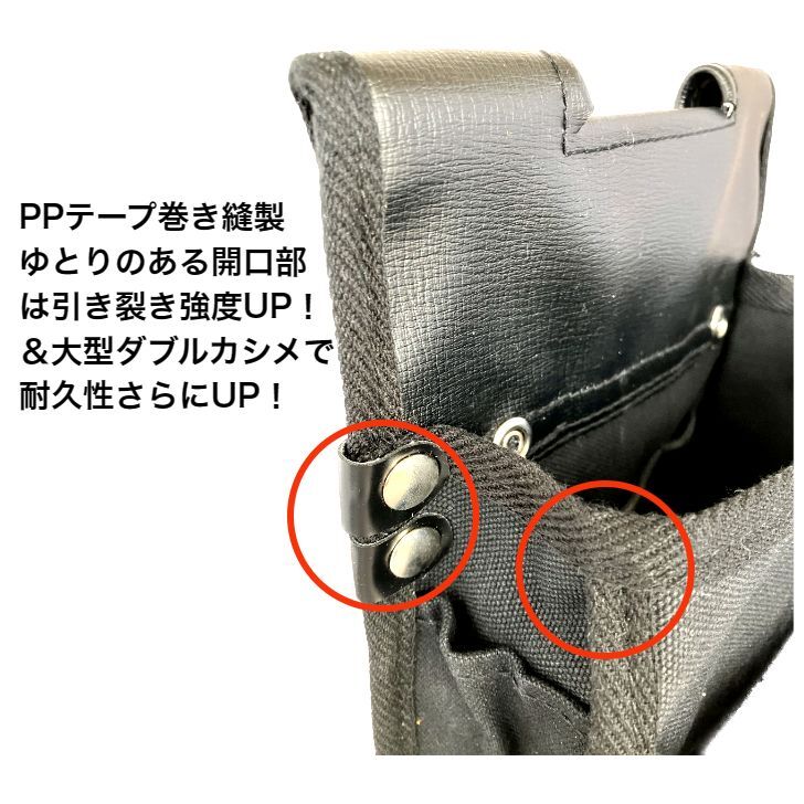 商品情報メーカー鳶壱(トビイチ)品番NXT-01 ネクスト腰袋2段式商品説明スタンダード2段式従来の腰袋のサイズ感を1から見直しました。ちょっとだけコンパクトなサイズ感、ゆとりのある収納部は出し入れがスムースです。Y型ハーネス対応で70mmのスリット幅を確保。ネクスト腰袋は撥水加工された6号帆布を使用しています。張りのある生地感です。サイズ・材質(外寸)高さ 約260mm 横幅 約180mm 厚さ:1段目 約50mmベルト通し裏は70mmのスリット入りです。【対応ベルト幅】60mmまで対応国産6号帆布撥水加工あり 底部 合革ヨレ止め防止PEプレート内蔵バリエーションNXT-02BK 3段式もございます。※カラー 黒のみ注意事項●本来の用途以外での使用はしないで下さい。●切りキズ、摩耗キズ、カシメ部分の破損・縫い合わせ部分のほつれなどが発生した場合は使用を中止して下さい。●水濡れ多少・摩耗により色落ち、色移りする場合があります。雨天での使用・淡い色の衣類の着用・汚れなどには十分注意して下さい。●刃物や鋭利な部分を出したまま使用しないでください。※モニターの発色具合によって実際の商品と色が異なって見えることがございます。ご了承ください。【耐久性を追求!】強化型腰袋 鳶壱 NXT-01 国産6号帆布製 中型サイズ 内ポケット付 Y型ハーネス対応 ヨレ止め防止 腰道具 鳶 足場屋 橋梁 鉄骨 建て方 tobiichi トビイチ 日本製 燕三条 従来の腰袋のサイズ感を1から再構築!傷みやすい箇所を補強した”強化型腰袋“!国産6号帆布を使用新潟三条で縫製、ALL JAPAN MADEです。 6
